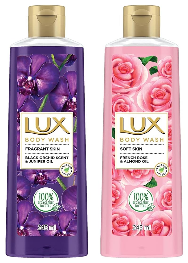Lux Shower Gel Black Orchid Fragrance & Juniper Oil Bodywash With Glycerine For Soft Skin Long Lasting Fragrance Paraben Free 245 mlWant extra from your soap? Switch to Lux Fragrant Skin Body Wash for 3 extra benefits. Indulge in extra foam extra softness with extra long-lasting fragrance. Bathe in fine fragrance inspired by the scent of Exotic Orchids & Juniper Oil designed to give up to 12 Hours of lasting fragrance after shower. The luxurious scent of exotic Black Orchids will turn your shower into a moment of pure pleasure. Crafted by the worlds best perfumers top notes of kumquat peel and redcurrant fill your senses before evolving into a seductive floral heart of black orchid jasmine and peony for perfume that indulges your senses. At the base of this LUX fine fragrance body wash sits patchouli and sensual amber rich scents that soften the fragrance and lingers on your skin. Formulated with glycerine a well-known skincare ingredient that helps preserve skins natural moisture Lux Fragrant Skin Body Wash leaves your skin feeling soft and glowing. Lather up for a sensorial shower like never before in just 3 steps: Step 1 - Create rich foam by pouring a coin sized drop on a wet loofah. Squeeze to make it lather. Step 2 - Massage rich lather on wet skin then rinse away thoroughly with water. Step 3 - Enjoy luxurious floral fragrance all day & soft glowing skin.Lux Shower Gel French Rose Fragrance & Almond Oil Bodywash With Glycerine For Soft & Glowing Skin Paraben Free 245 mlWant extra from your soap? Switch to Lux Soft Skin Body Wash for 3 extra benefits. Indulge in extra foam extra softness in an extra gentle formula. Indulge in a daily bath that captivates your senses with a delicate blend of French Rose extract & sweet Almond oil that leaves your skin feeling soft and glowing. The alluring scent of French Roses will turn your shower into a moment of pure pleasure. Crafted by the worlds best perfumers top notes of bergamot and red fruits fill your senses before evolving into a feminine floral heart of rose white florals and violets for perfume that indulges. At the base of this LUX fine fragrance body wash sits musk amber and vanilla sweet scents that softens the fragrance and lingers on your skin. Formulated with glycerine a well-known skincare ingredient that helps preserve skins natural moisture Lux Soft Skin Body Wash leaves your skin feeling soft and glowing. Lather up for a sensorial shower like never before in just 3 steps: Step 1 - Create rich foam by pouring a coin sized drop on a wet loofah. Squeeze to make it lather. Step 2 - Massage rich lather on wet skin then rinse away thoroughly with water. Step 3 - Enjoy an alluring floral fragrance and soft glowing skin.