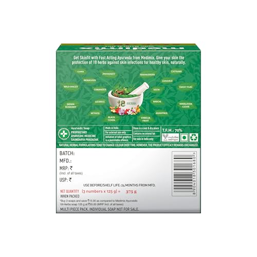 Medimix classic with its 18 herbs ayurvedic formula nourishes and protects your skin. This traditionally hand made 18 herbs ayurvedic soap that is effective in treating acne blemishes prickly heat and other skin ailments. This 18 herbs unique formula has been enhanced to make the soap effective and last longer to keep you and your family naturally protected. The birth of Medimix dates back to a time when the cholayil family used viprathi oil as a cure to ailments of the skin.
