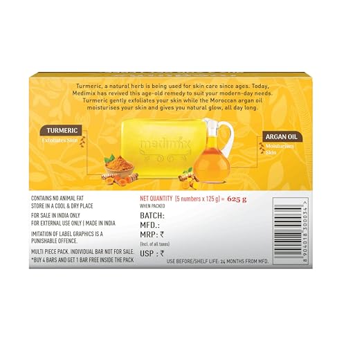 This unique formulation of Medimix Turmeric and Argan oil helps to exfoliate tired skin effective for skin hydration and gives your skin the naturalmoisture that comes from pure Moroccan Argan Oil. Direction: Apply gently on body Suggested Usage: Apply atleast Twice a day for best results