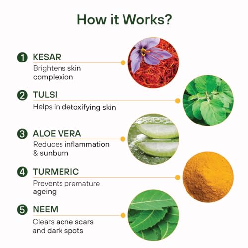 This soap contains kesar, neem, haldi , tulsi and aloevera. All ingredients are beneficial for your skin. It gently eliminate impurities, while enriching your skin . Its really nice product.
