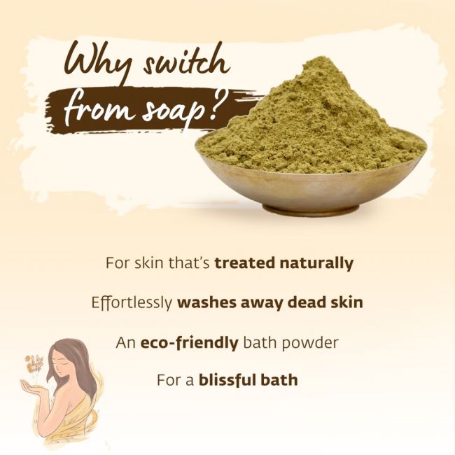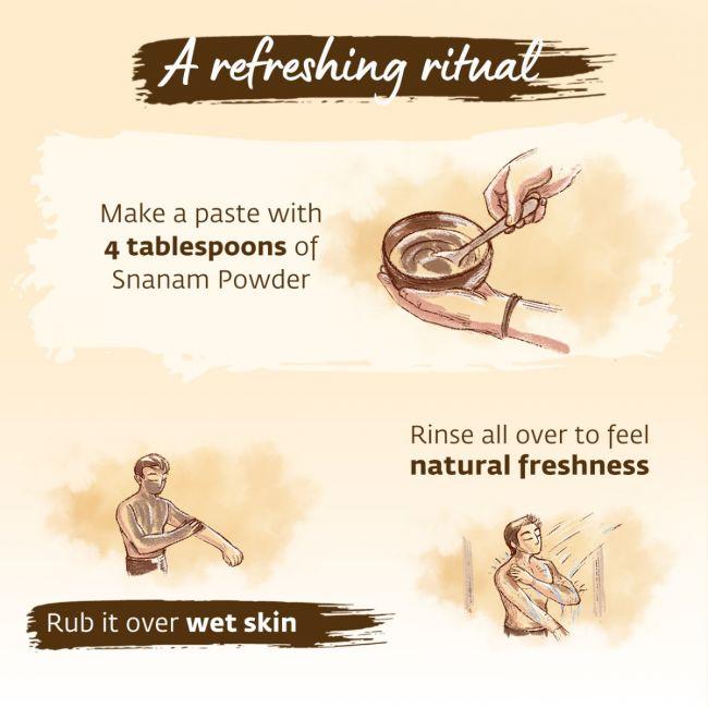 A traditional ritual passed down generationsmade with rare herbs and medicinal roots,"Kasturi manjal, vetiver, neem and turmericfor skin that glows with health and vibrance.Snanam, a cleansing ritual of more than just the body.A unique Siddha formulation for natural cleansing, Ishas Ojisvini Herbal Snanam Powder puts together in right proportions, the saviors of beautiful skin, tulasi, neem, amla and green gram along with a few other roots and herbs to give you a refreshing bathing experience. With no chemical additives, this Herbal Snanam Powder is a conscious choice towards a greener planet.