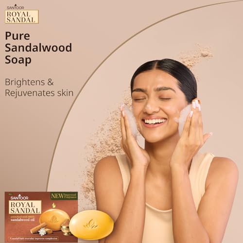 Enjoy bathing in the pure fragrance of sandalwood. The only soap having real sandalwood. Santoor Royal Sandal gives your skin a radiant glow.