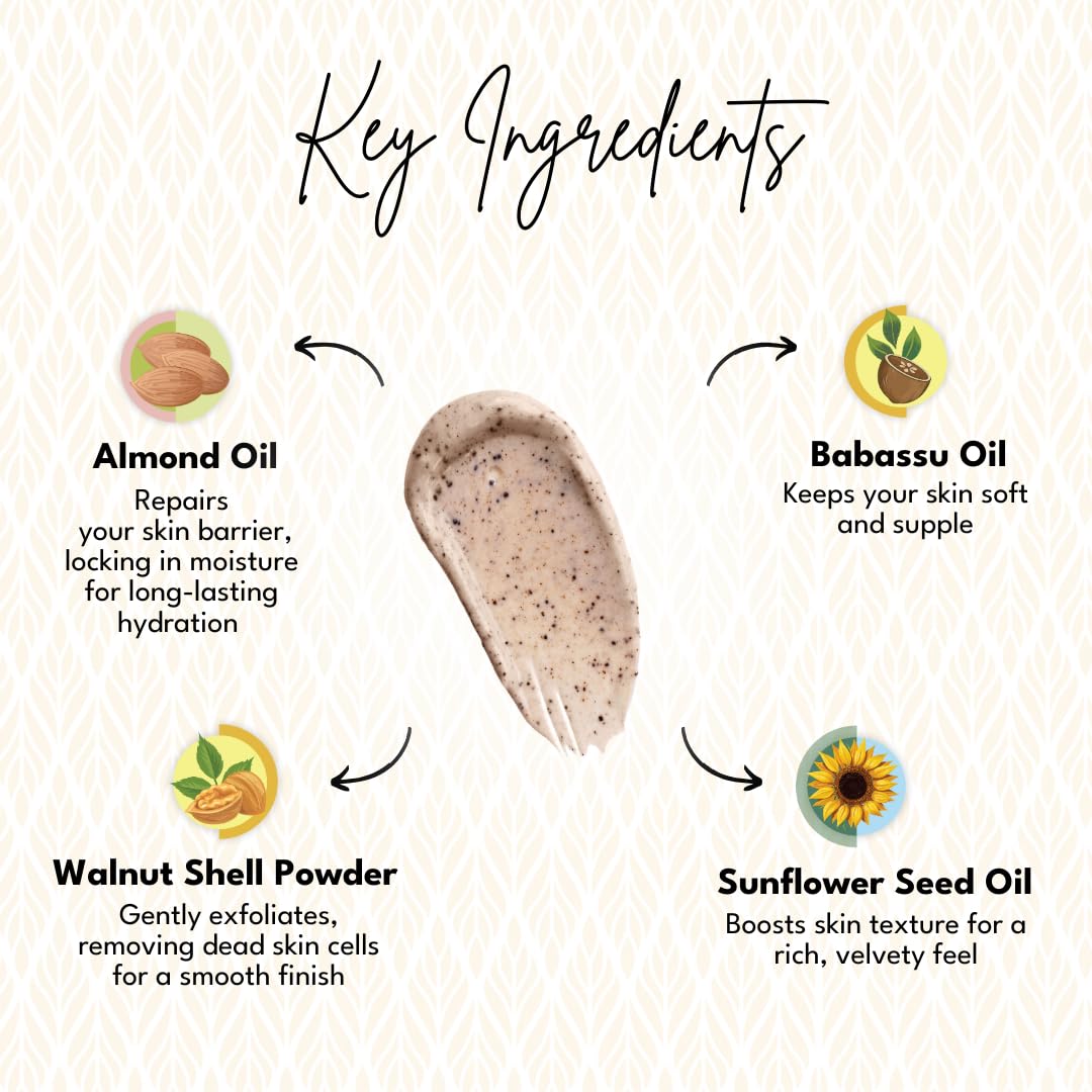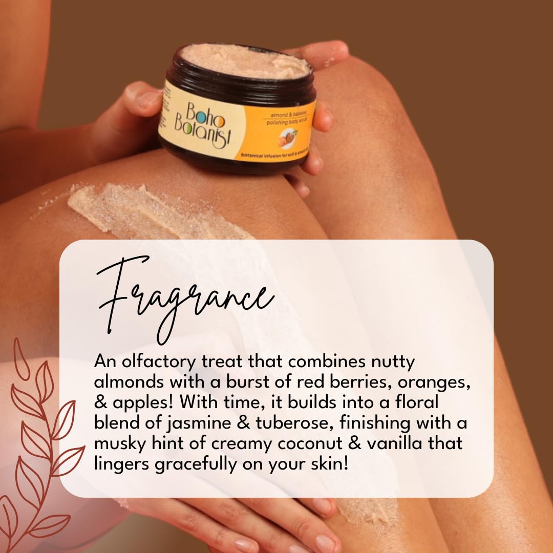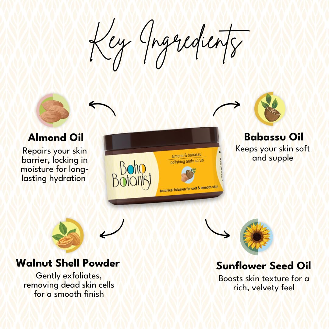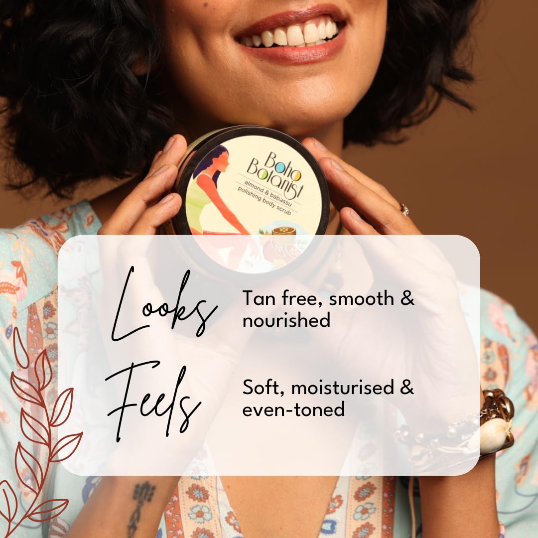 Pour a dollop of goodness on your palm with this Body Scrub and find yourself amidst an enchanted botanical garden. Infused with the goodness of 8 plant based- oils, Boho Botanist Almond & Babassu Polishing Scrub is a botanical concoction that caresses fatigued skin by bringing you natures best potion packed in a bottle. Helps in skin exfoliation, tan removal and skin radiance. Also, helps in removing dead skin and is a great pre-step for your shaving ritual. Ideal for men and women and suitable for all skin types.