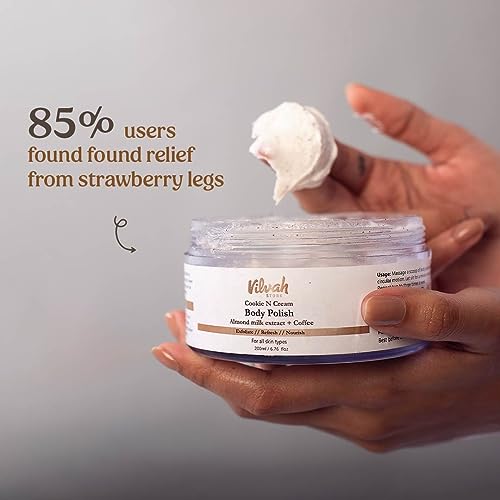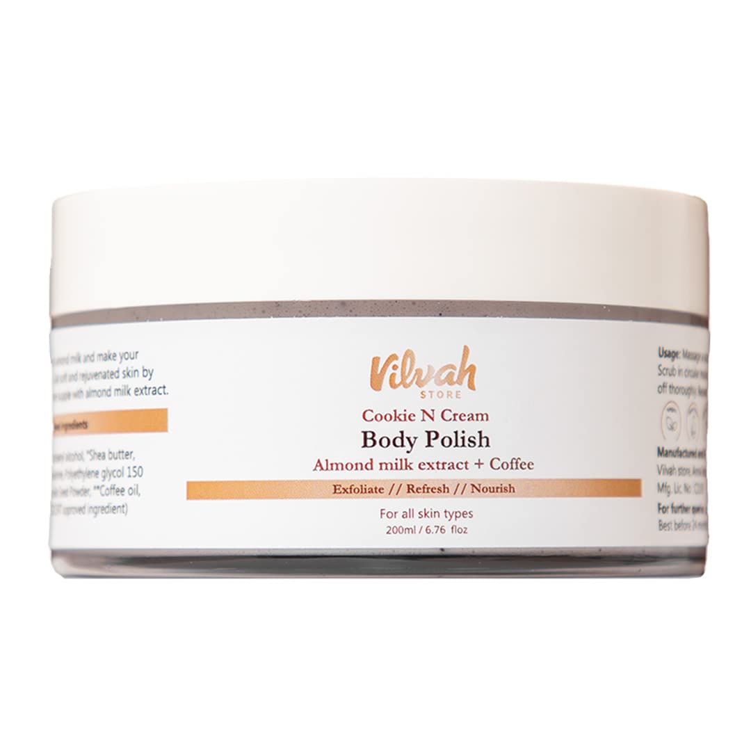 Vilvah's COOKIE n CREAM body polish is the food that your skin needs. Formulated with coffee powder to effectively slough away dead cells while unclogging the pores and fading tan. Alongside Almond milk to firm your skin to leave it supple the medley of Shea butter Olive oil Argan oil helps to nourish and condition skin from top-to-toe. The long lasting aroma helps you feel pampered refreshed and leaves your skin beautifully fragranced.