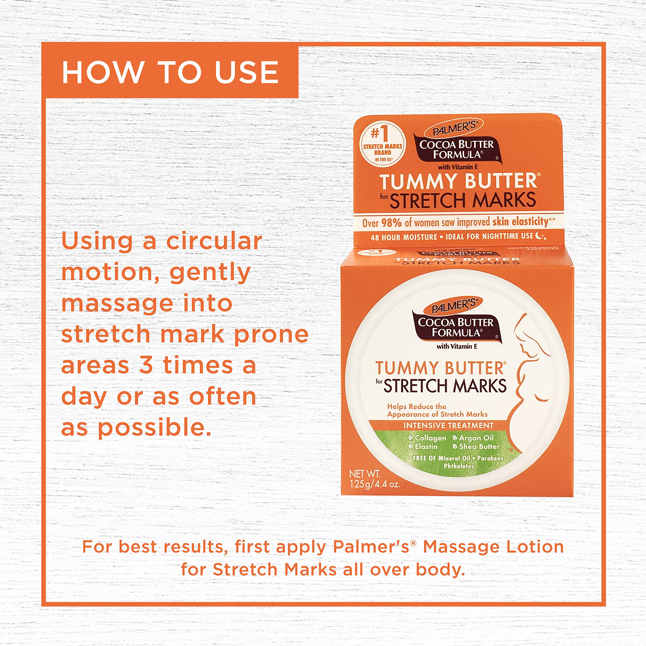 Product Description This highly concentrated formula with Cocoa Butter Vitamin E Collagen Elastin and soothing Lavender Oil is widely recommended for stretch marks during and after pregnancy. Penetrates as deep as the dryness and helps restore vital moisture. Smoothes marks and tones skin. It is widely recommended for stretch marks during and after pregnancy.Features: Penetrates as deep as the dryness and helps restore vital moisture. It is widely recommended for stretch marks during and after pregnancy. Smoothens marks and tones skin. Clinically and dermatologically tested. From the Manufacturer Tummy Butter is an ultra- concentrated night-time treatment speci - cally designed for pregnancy stretch marks. Enriched with soothing and relaxing lavender extracts new Bio C-Elaste pure Cocoa and Shea Butters and Vitamin E it has been proven to help improve skin's elasticity & moisture. With regular use it can help reduce the possibility of developing stretch marks. This intensive and non-greasy butter can also help relieve dryness and itchiness associated with stretched skin during pregnancy. Ingredients Theobroma Cacao (Cocoa) Extract Microcrystalline Wax (Cera Microcristallina) Mineral Oil(Paraffinum Liquidum) Theobroma Cacao (Cocoa) Seed Butter Prunus Amygdalus Dulcis (Sweet Almond) Oil Dimethicone Soluble Elastin Soluble Collagen Tocopheryl Acetate Centella Asiatica Extract Argania Spinosa Kernel Oil Lavandula Angustifolia (Lavender) Oil Carthamus Tictorius (Safflower)Seed Oil Isopropyl Myristate Zea Mays (Corn) Oil Beta-Carotene (CI 40800) Fragrance 01-11-44603 Benzyl Cinnamate Benzyl Benzo- ate Benzyl Alcohol Coumarin Linalool. Lavender. Key FeaturesDeeply intensive moisturizer helps reduce the appearance of stretch marks.Advanced formula contains Pure Cocoa Butter Vitamin E Collagen Elastin soothing Lavender Oil and our exclusive Bio C-ElasteBio C-Elaste is our special blend of proactive stretch mark fighting ingredients that combines Collagen Elastin Centella Asiatica Argan Oil Sweet Almond Oil and a proven elastase inhibitor to help smooth skin and improve marks.Intensive treatment formulation ideal for nightime use for maximum moisturization of expanding tummy. Calming lavender scent helps moms to relax more easily!Hypoallergenic- Paraben-Free â Phthalate-Free and Dermatologist Tested. Key IngredientsCocoa Butter Deeply moisturizing natural ingredient that helps improve skins moisture levels reduces stretch marks appearance and heals dry skin.3 Vitamin E A powerful natural antioxidant that enhances the protective function of skin and minimizes lipid loss. Wonderful treatment for skin damage and scarring. Collagen Collagen is a protein which occurs naturally in the human body. It's the building block of skin and it gives skin its remarkable ability to bind together.Elastin Elastin is a protein found in the skin. It gives skin elasticity. By increasing your body's ability to regenerate collagen and elastin you increase the skin's ability to remain exible.Shea Butter Shea Butter is a natural fat extracted from the Shea (Karite) tree. An ultra gentle yet effective moisturizer that contains anti-inflammatory properties and is naturally packed with Vitamins A E & F. Widely recommended for sensitive stressed skin.Centella Asiatica Centella Asiatica is a natural leaf extract that has been shown to help protect and revitalize collagen and elastin fibers. Widely recommended as an ideal ingredient for stretch mark care.Sweet Almond Oil Sweet Almond Oil - a non-greasy super moisturizing emollient extracted from the kernel of Almond seeds. Sweet Almond Oil is rich in Vitamins A B1 B6 B2 and E as well as Omega-9 and Omega-6 fatty acids. The lightweight oil is easily absorbed into the skin and its antimicrobial properties help reduce the chances of scarring and markings on skin.Argan Oil Argan Oil is commonly referred to as âliquid goldâ and has twice as much Vitamin E as olive oil and is rich in essential fatty acids and vital antioxidants. Helps soften and condition skin while reducing scarring.