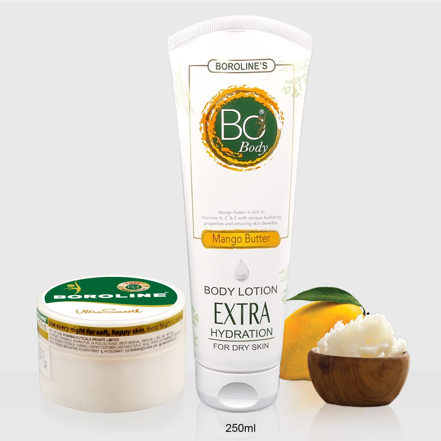 BOROLINE Bo Body Lotion 250 ml With Mango Butter + Ultrasmooth Night Cream 100 gm | 24 hrs Deep Moisturizer For Dry Skin Enriched with Lanolin Oil Glycerine (Pack of 2)