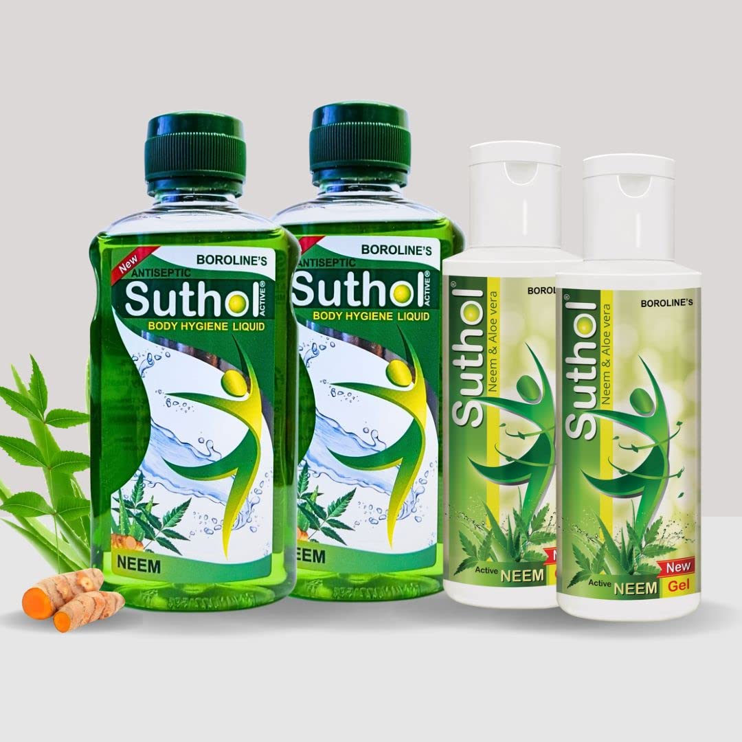 BOROLINE's Suthol Active Neem Gel 100 ml X 2 & Neem 200 ml X 2 Stops Skin Irritations Prickly Heat Itching Rashes With Neem Tumeric (Pack of 4)