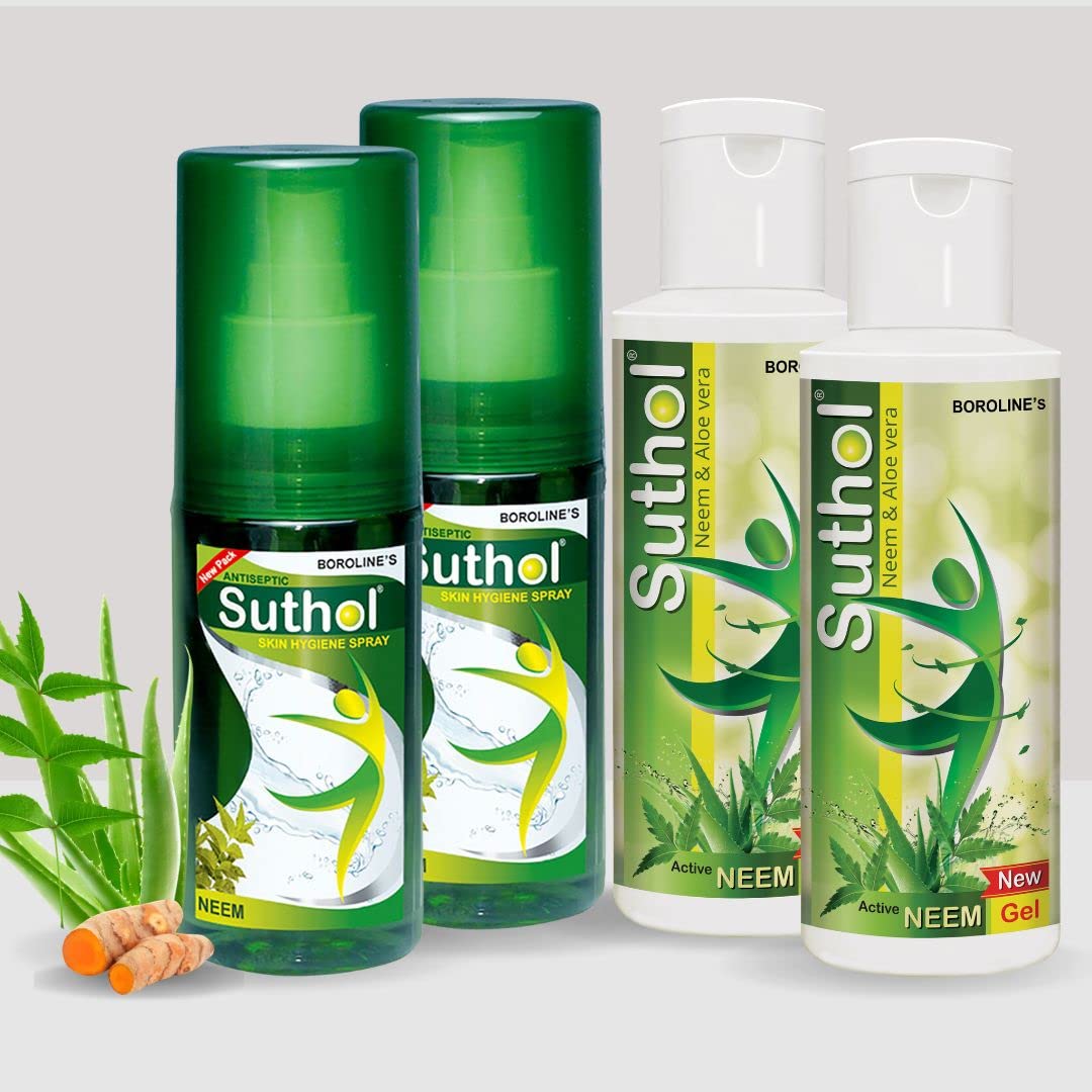 BOROLINE's Suthol Active Neem Gel 100 ml X 2 + Neem Spray 100 ml X 2 | Stops Skin Irritations Prickly Heat Itching Rashes | With Tumeric & Aloe vera | Ayurvedic Antiseptic Spray & Gel (Pack of 4)