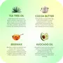• Tea Tree Oil helps in irritation and itching while Beeswax helps eliminate the dead skin. Together they blemishes and spots to give you younger-looking radiant skin.