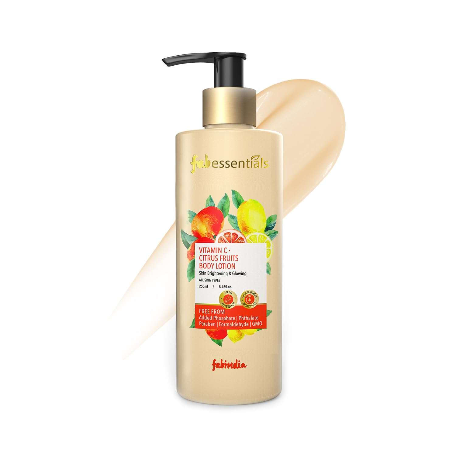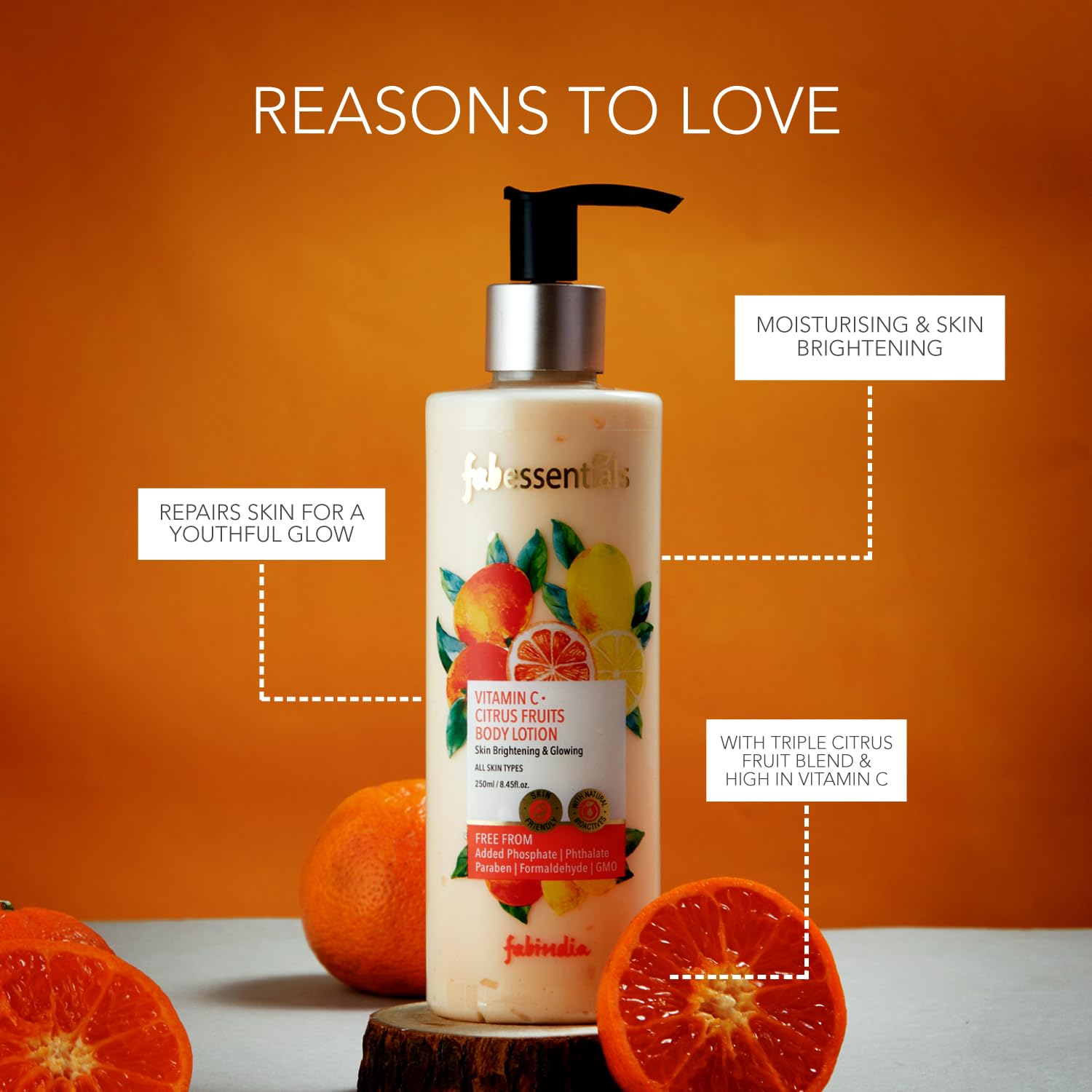 Fabessentials Vitamin C Citrus Fruits Body Lotion -250 ml | Orange Oil Lemon Amla & Almond Oil | Moisturising Brightening & Energising Skin for a Youthful Glow | Non-Sticky Body Lotion for Women & Men