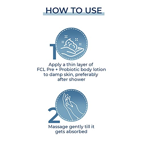 • DIRECTIONS FOR USE: Apply a thin layer of FCL Pre + Probiotic body lotion to damp skin preferably after shower and massage gently till it gets absorbed