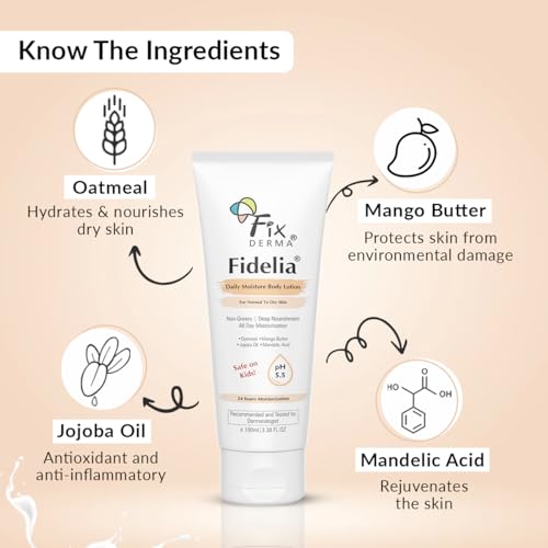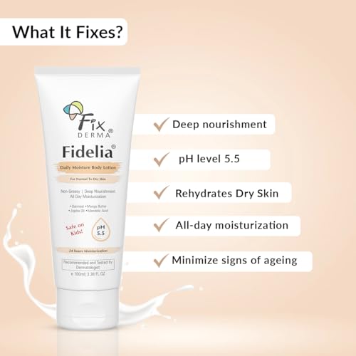 An all-day deep nourishing and skin-soothing body lotion Fidelia is a daily moisturizing body lotion specifically formulated for normal to dry skin. With a pH-balanced formulation of 5.5 this lightquickly absorbing body lotion leaves skin feeling moisturized soft and smooth without feeling greasy. It is infused with skin-hydrating ingredients such as oatmeal and mango butter that seal in moisture and protect skin from environmental damage.