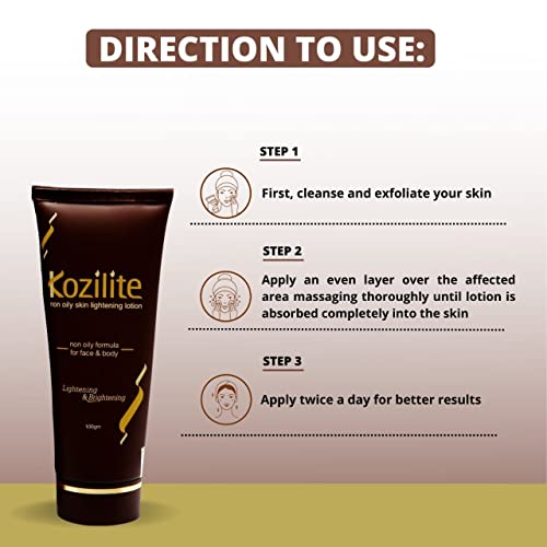 Kozilite Non Oily Skin Lightening Lotion 100gm - Pack of 1: Description: Kozilite non-oily skin lightening lotion with its special actives helps to reduce blemishes and lightens and brightens the skin tone. It has multiple actives which work at multiple levels to give you the glow that matters. Kozilite lotion has got balance safety and efficacy with the help of its botanical extracts and special skin lightening actives. The skin vitamins and UV filters nourish and protect your skin. Kozilite lotion is available in a 50 gm pack & 100 gm of bigger economical pack.Non oily formula for face and bodyHelps to reduce blemishesLightens and brightens the skin tone