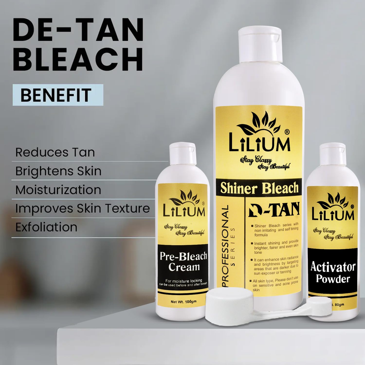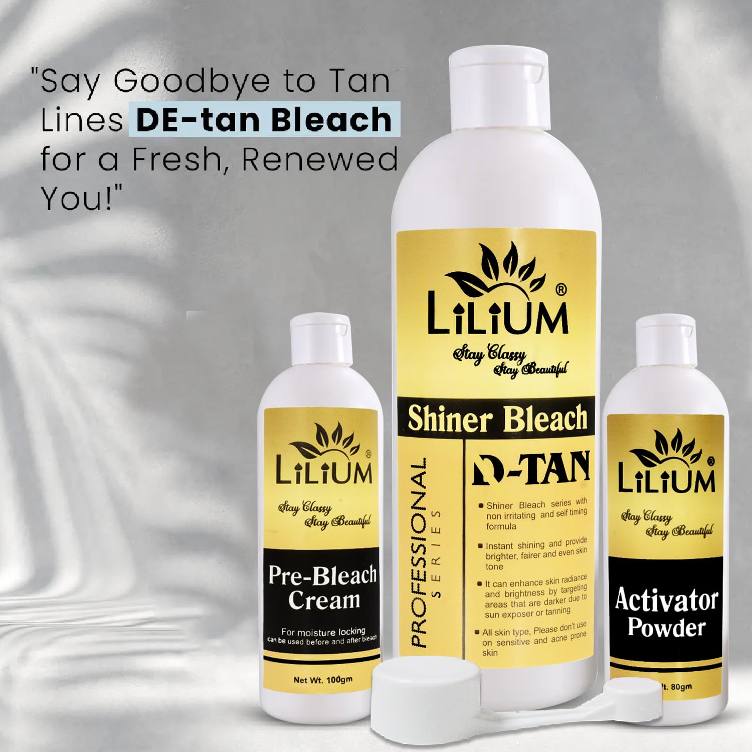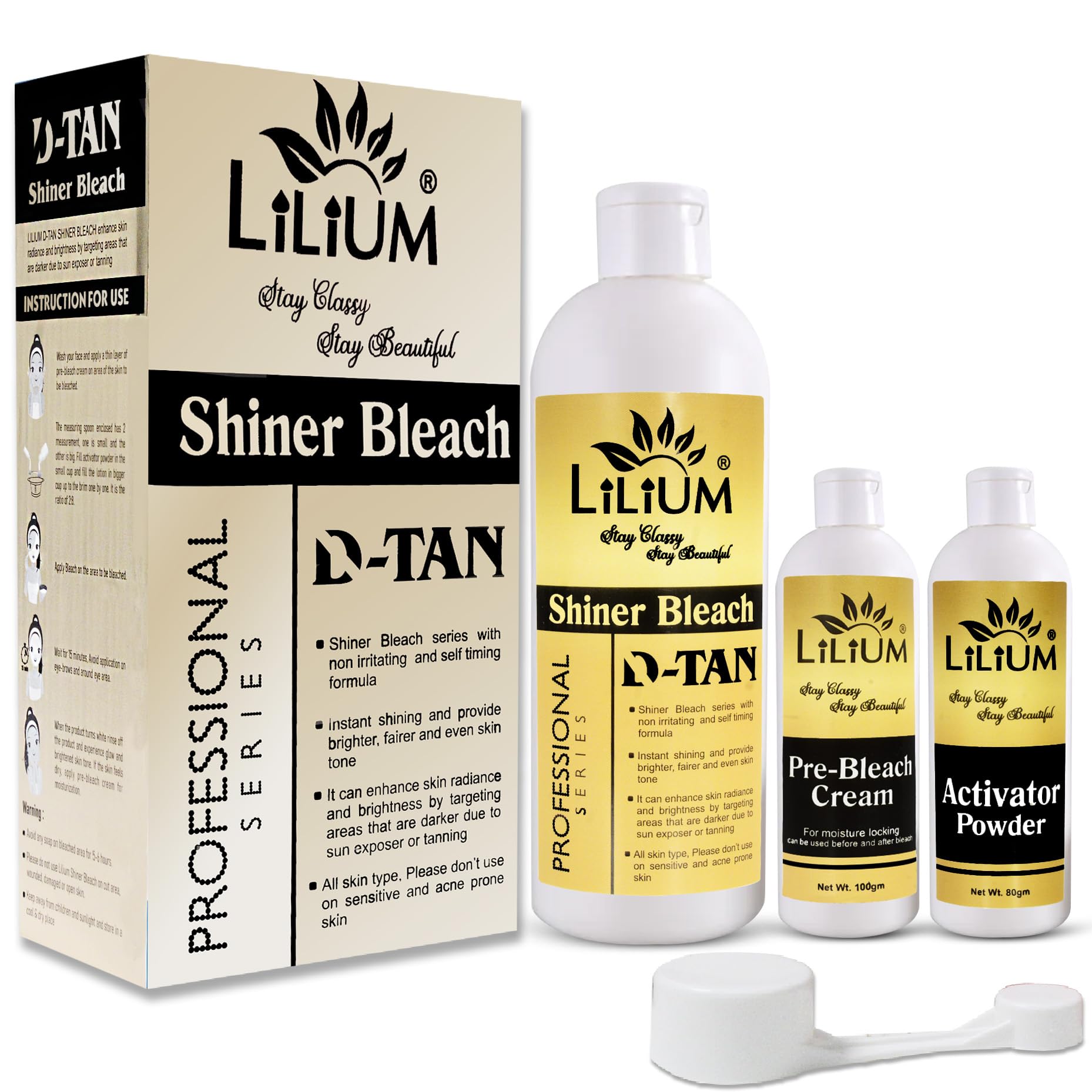 LILIUM D-TANSHINER Shiner Bleach ek advanced skin brightening solution hai jo specially design kiya gaya hai sun tan aur dullness ko remove karne ke liye. Is bleach ka self-timing aur non-irritating formula uneven skin tone ko visibly improve karta hai aur glowing fresh look deta hai. Ye professional series bleach tan-prone areas par effectively kaam karta hai jaise face neck arms etc. Har pack mein aapko milta hai complete bleach combo – Pre-bleach cream lotion activator aur measuring spoon – jise use karna easy aur convenient hai. Sirf 15 minutes mein paaye smooth glowing aur fairer skin at home.