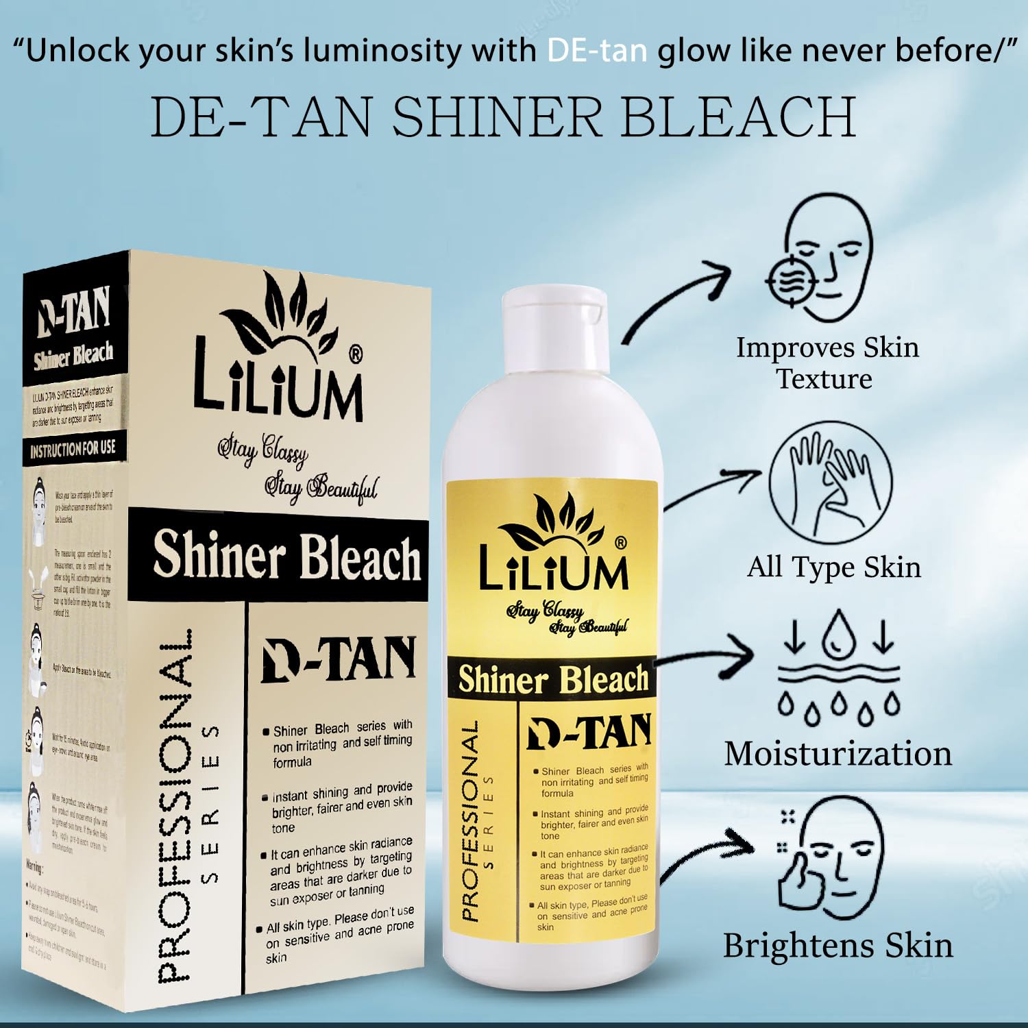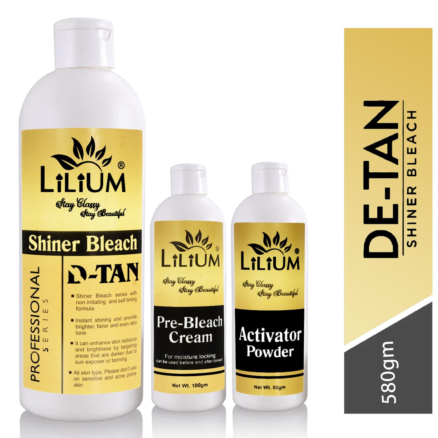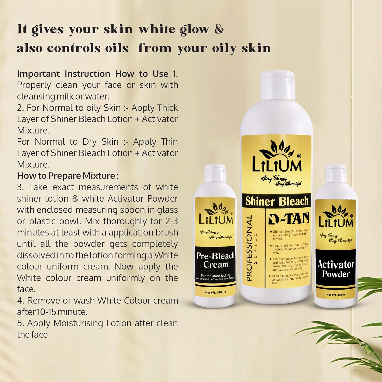 LILIUM D-TANSHINER Shiner Bleach ek advanced skin brightening solution hai jo specially design kiya gaya hai sun tan aur dullness ko remove karne ke liye. Is bleach ka self-timing aur non-irritating formula uneven skin tone ko visibly improve karta hai aur glowing fresh look deta hai. Ye professional series bleach tan-prone areas par effectively kaam karta hai jaise face neck arms etc. Har pack mein aapko milta hai complete bleach combo – Pre-bleach cream lotion activator aur measuring spoon – jise use karna easy aur convenient hai. Sirf 15 minutes mein paaye smooth glowing aur fairer skin at home.