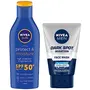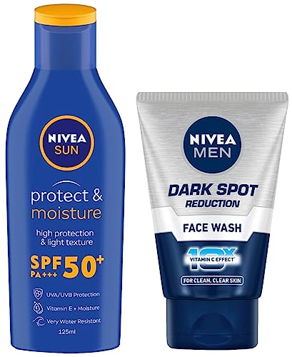 NIVEA MEN Face Wash Dark Spot Reduction 100mlDetailsNivea For Men Advanced Whitening Cell Repair Face Wash 7in1 The mild cleansing 7-in-1 foam with cell repair properties gives you deep cleansing and long lasting freshness. The Vitamin Ginseng Complex whitens the skin from within for noticeably fairer and healthy looking skin. Daily Use Direction Apply morning and evening with water avoid eye contact.Qty 100mlNIVEA Sunscreen Lotion Sun Protect and Moisture (SPF 50) 125mlMoisturising Sun Lotion No more waiting for 20 minutes before you step out into the sun! NIVEA's caring formula let's you enjoy instant & long-lasting sun protection.