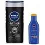 NIVEA Sun Lotion SPF 30 with UVA & UVB Protection Water Resistant Sunscreen for Men & Women 75 mlNivea sun protect & moisture lotionâs immediate absorption formula provides advanced collagen protection that prevents wrinkles. It restores the skinâs moisture lost due to sun exposure. Nivea sun protect & moisture lotion is non-oily non-greasy and water resistant. Also available in spf 50. Compatibility dermatologically proven.NIVEA Men Body Wash Active Clean with Active Charcoal Shower Gel for Body Face & Hair 250 mlNivea men active clean shower gel deep cleanses your body while being mild on your skin. This innovative 3-in-1 shower gel for body face and hair has natural active charcoal which works as a dirt magnet and cleanses your skin thoroughly without drying it out. Let this effective yet mild gel with masculine scent transform into a white caring foam which keeps your skin hydrated. Skin tolerance dermatologically proven. It leaves your skin and hair feeling refreshed revitalized and deeply cleansed. Provides long lasting freshness.