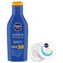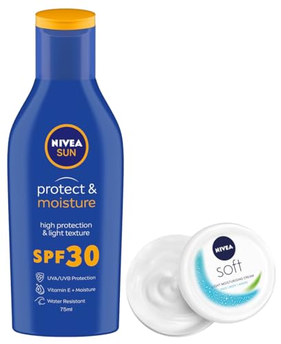 NIVEA SUN Protect and Moisture 75ml SPF 30 Sunscreen| PA++ UVA - UVB Protection System| Water Resistant| For Men & WomenNivea sun protect & moisture lotionâs immediate absorption formula provides advanced collagen protection that prevents wrinkles. It restores the skinâs moisture lost due to sun exposure. Nivea sun protect & moisture lotion is non-oily non-greasy and water resistant. Also available in spf 50. Compatibility dermatologically proven.Nivea Soft Light Moisturizer For Face Hand & Body Instant Hydration Non-Greasy Cream With Vitamin E & Jojoba Oil 200 MlGreasy heavy body lotions during the hot summers leave your skin feeling sweaty and uncomfortable. But now thereâs an ultra-light body lotion that protects you from sun damage and gently moisturises your skin. Nivea uv protection body lotionâs light and non-greasy formula makes it perfect for the summer. Step out into the sun without worrying about sun damage because Nivea uv protection body lotion nourishes skin during your time out of home! Its uva and uvb filters protect you from the sunâs harmful rays that cause skin darkening and ageing. For best results apply a coin-sized amount of the lotion onto dry skin after a shower. The Nivea uv protection body lotion is free of animal derived ingredients and colourants. It is dermatologically approved and suitable for all skin types. Highly effective intensive moisturizing cream. Quickly absorbs and refreshes the skin. Leaves your skin soft and supple. For everyday use. Skin compatibility dermatologically approved.