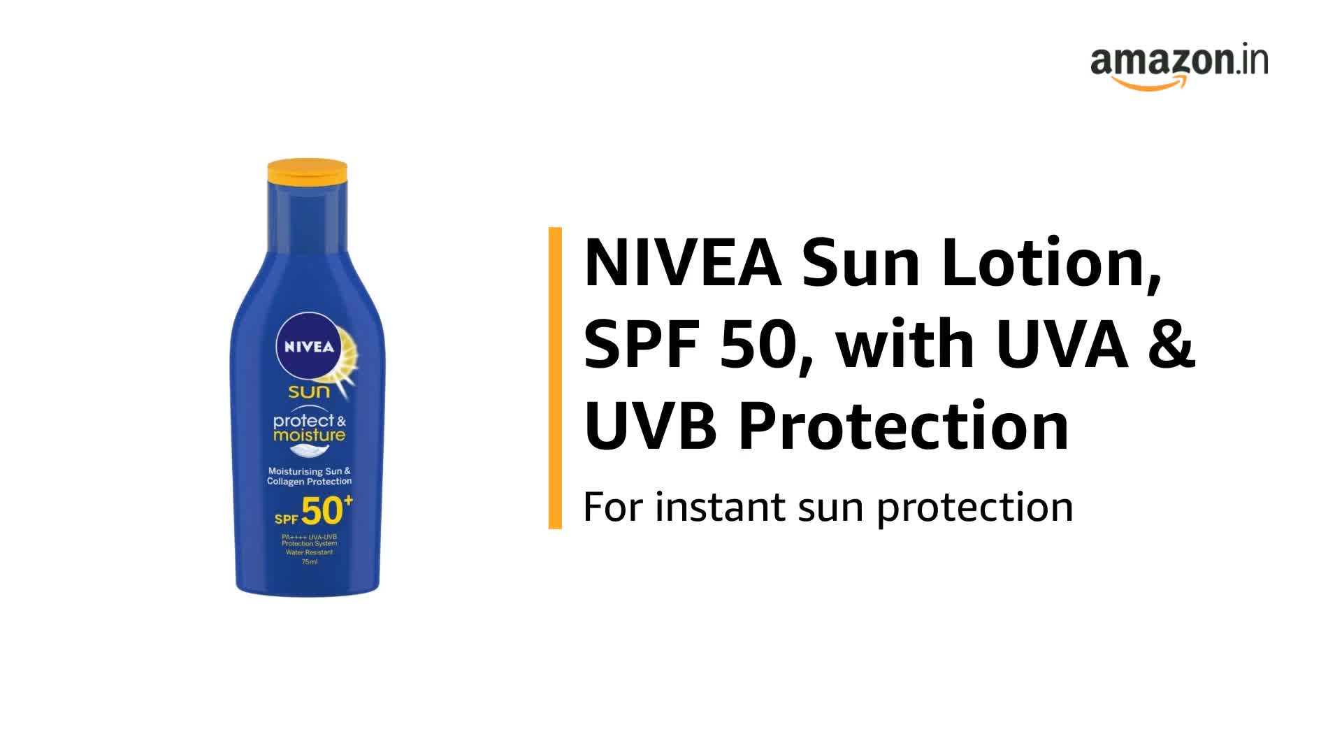 NIVEA Sunscreen Lotion Sun Protect and Moisture (SPF 50) 125mlMoisturising Sun Lotion No more waiting for 20 minutes before you step out into the sun! NIVEA's caring formula let's you enjoy instant & long-lasting sun protection.NIVEA Sunscreen Lotion Sun Protect and Moisture (SPF 50) 75mlNivea Sun Moisturizer Lotion SPF-50 75ml Enriched with a good number of moisturizing properties this lotion is formulated to lay protection to your delicate skin against the against the harmful effect of UV rays. It will make your skin more youthful and radiant than before. In addition to this it delivers nourishing effect on the skin and keep off the dullness. Features: Comes From the House of Nivea Lays Protection to the Skin Against the harmful UV Rays Formulated with a Good Number of Moisturizing Ingredients Nourishes the Skin and Keeps off the Dullness
