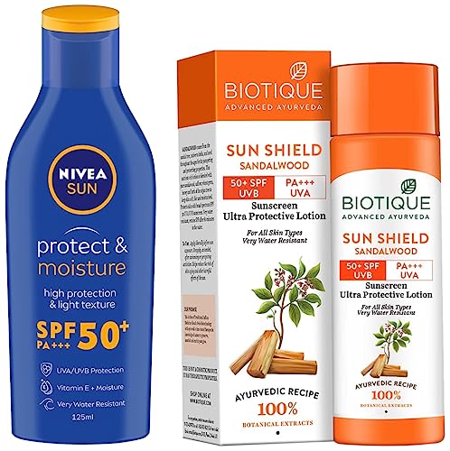 Nivea Sunscreen Lotion, Sun Protect And Moisture (Spf 50), 125Ml And Bio Sandalwood Sunscreen Ultra Soothing Face Lotion, Spf 50+ For All, Oily Skin Types, 120Ml, Pack Of 1
