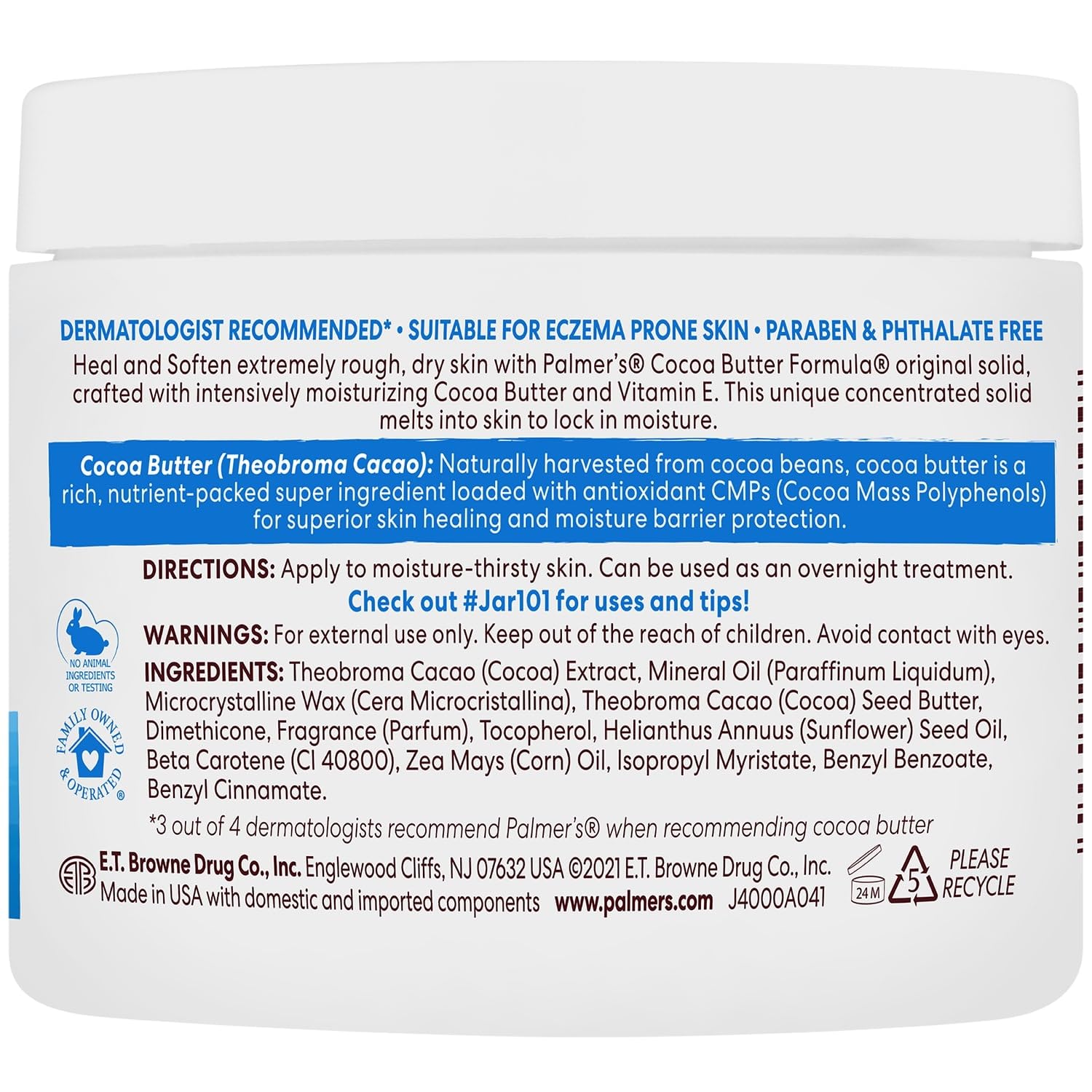 Product Description Palmer's Cocoa Butter Formula to help the appearance of scars and marks. Rich in vitamin E to help lighten marks it o has healing properties and tones skin while providing deep moisturization. Features: Butter formula has a soothing emollient base Recommended for stretch marks during and after Made with pure cocoa butter Heand softens rough skin Tones the skin to an even shade Works as an advanced moisturizer From the Manufacturer Cocoa Butter is a healthy core substance inside the cocoa seed. One of the main benefits of Cocoa Butter is that it helps retain the moisture between skin layers preventing skin de-hydration. Our Cocoa Butter o contains Vitamin E with its fantastic anti-oxidant elements that can help the anti aging process. Cocoa Butter has an efficient way in softening the skin and removing skin marks with regular usage leaving the skin looking healthy and radiant. BenefitsContains 100% pure Cocoa Butter G Vitamin E to soften dry skinMelts at body temperature for raand deep absorptionSmoothes marks G scars and tones skinPromotes skin healingProtects and forms an effective barrier from the aging affects of the sunHedry skinWhat makes Cocoa Butter good for your skin?Cocoa Mass Polyphenols - Combination of powerful Anti-prevents skin damage helps prevent wrinkles.Vitamin E - Anti-help prevent ageing protects collagen from damage Palmer's extra Vitamin E into every Cocoa Butter Formula.Olec Acid - Promotes cell regeneration anti-soothes breakouts.Protects - Forms an effective barrier from environmental pollutants sein moisture all day to combat dryness.Nourishes - Vitamin & mineral rich promoting skin health.Promotes Skin Healing - acne scars stretch marks encourages racell regeneration. IngridientsWater (Aqua) Theobroma Cacao(Cocoa) Extract Glyceryl Stea-rate Petrolatum Propylene Glycol Glycerin Cocos Nucifera(Co-conut) Oil Mineral Oil (Paraffinium Liquidum) Theobroma Cacao (Cocoa) Seed Butter Elaeis Guineensis Oil Cetyl Alcohol Di-methicone Tocopheryl Acetate Hydroxyethylcellulose PEG-8 Stea-rate Behentrimonium Methosulfate Butylene Glycol Stearalkoni-um Chloride Cellulose Sodium Acetate Fragrance (Parfum) Phe noxyethanol Sorbic Acid Benzoic Acid Stearyl Alcohol Myristyl Al-cohol Yellow 5 (C119140) Orange 4 (C115510) Benzyl Alcohol.