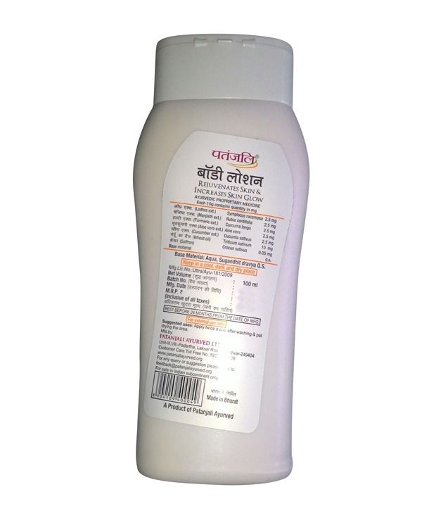Patanjali Body Lotion is Ayurvedic Propriety Medicine .that helps rejuvenate skin glow and contains extracts of turmeric, aloe vera, cucumber and saffron that will keep your skin smooth and soft.Patanjali Body lotion is useful in rejuvenating the skin. It also increases the glow of the skin. It is used for various skin disorders. It also treats various skin diseases like itching, black spots, pimples, dry skin, cracking of skin. It helps in healing the damage skin tissues. It gives glow to the skin and keeps the harmful bacteria away from the body. It also clears the skin from blackheads and spots. It cools and soothes irritated skin. It is also used as a beautifying agent. It gives a healthy glow and brightness to the body.* Skin Disorder* Itching* Black spots* Pimples* Dry Skin* Blackheads* Cracking of skinManjistha, turmeric, sandalwood, wheat germ oil, aloe vera, cucumber, saffron