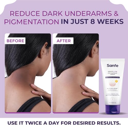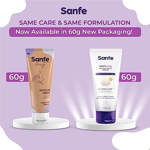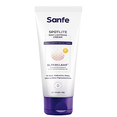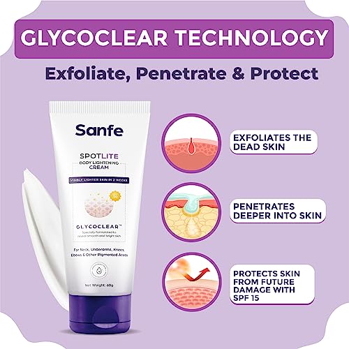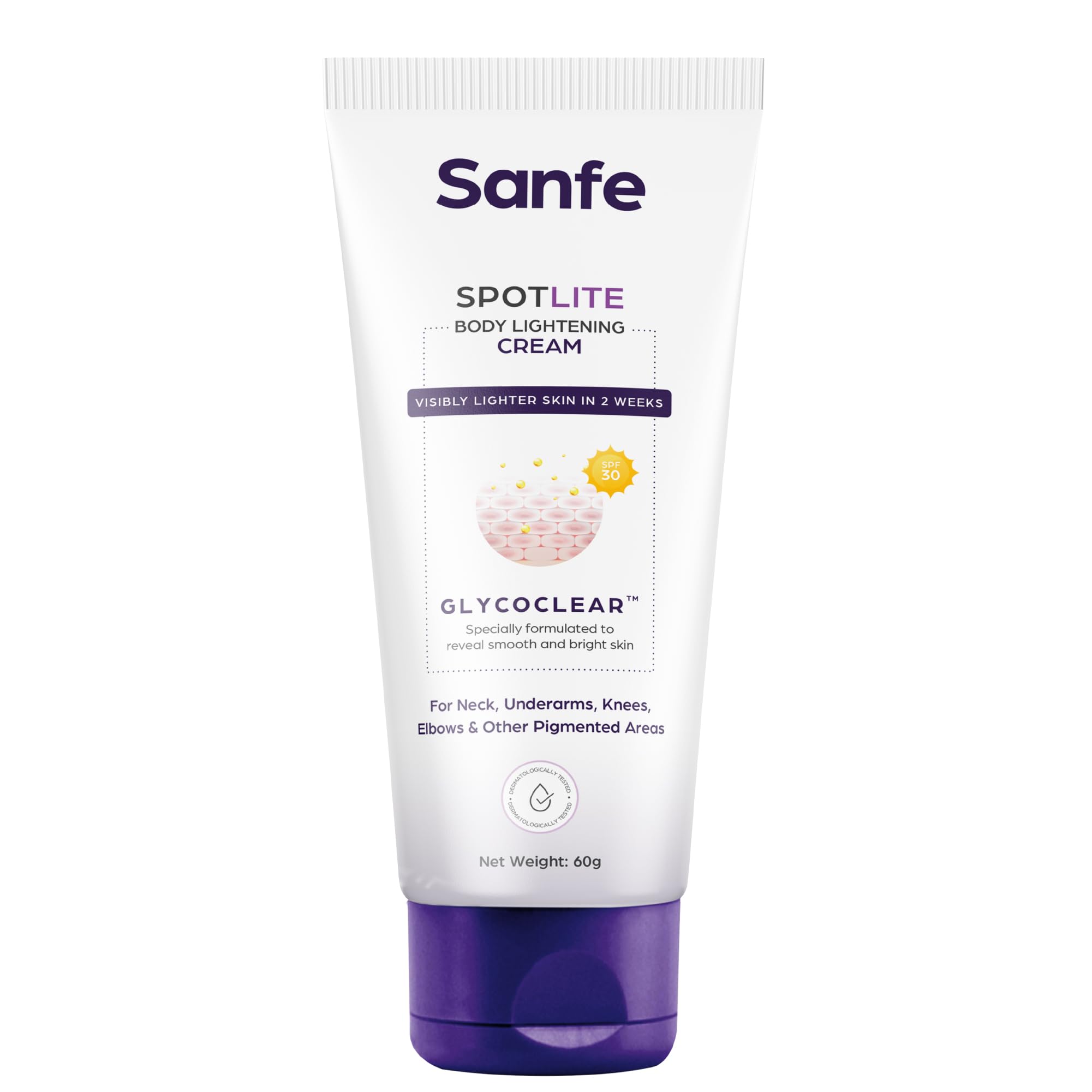 Sanfe Spotlite Body Cream For Dark Neck, Joints and Skinfolds | Enriched with 3% Glyoclic Acid, Alpha Arbutin & SPF 30 | For Dark Patches, Detanning, Anti Aging and Skin Tightening | Helps in Exfoliation, Lightening & 24 Hr Long Moisture - 60gm | For Indi