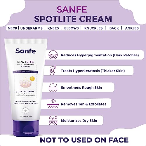 • ONE IN ALL SOLUTION: Sanfe Spotlite Cream formula for skin imperfections of overlooked areas. It treats dark patches and discoloration of the neck ankles knuckles back inner thighs knees and elbows. It helps you reveal dramatically smoother skin by exfoli