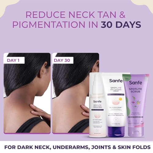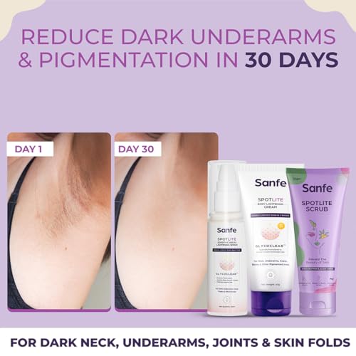 • HOW TO USE: First exfoliate dead skin cells with the help of Sanfe Dark Spot Sensitive Body Scrub. Second apply the Sanfe Dark Spot Sensitive Body Serum on sensitive body areas like underarms. Last Sanfe Dark Spot Body Serum Cream on joints neck and skin