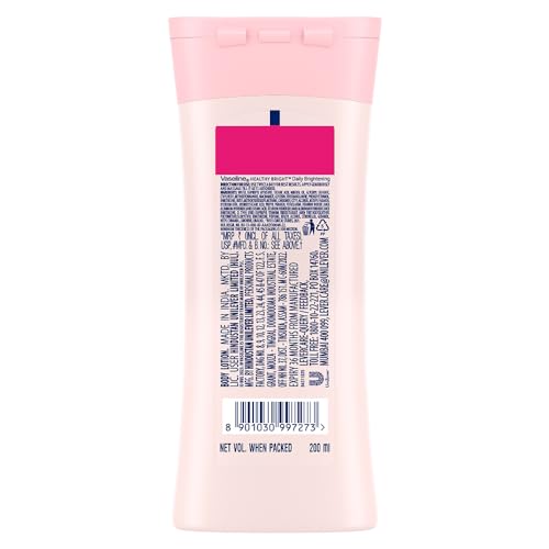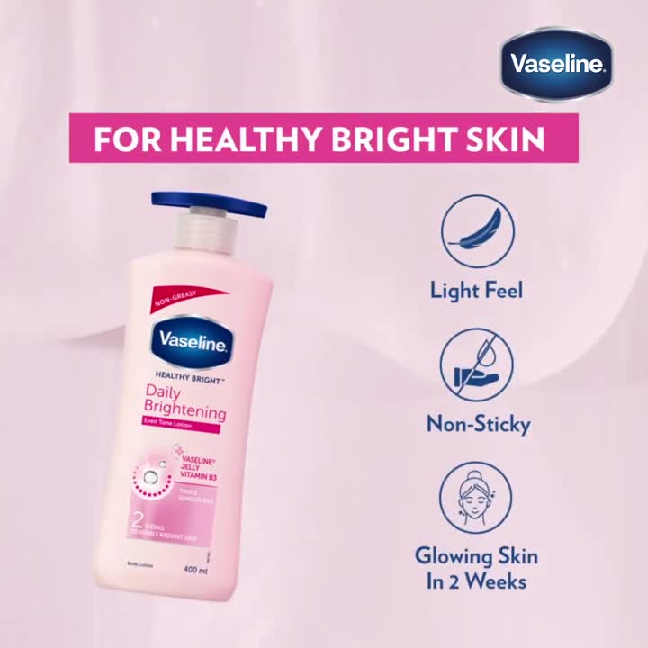 Having healthy glowing skin is a vital part of your overall health. Vaseline believes that everyone deserves a healthy skin. But healthy skin is not something you get by masking problems or through quick fixes. With sun exposure your skin produces melanin which can lead to skin damage dull and uneven skin tone. Vaseline Healthy Bright Daily Brightening our best skin brightening body lotion helps restore dry damaged skin and that gives visibly glowing skin in 2 weeks. With micro-droplets of Vaseline Jelly the lotion helps heal* skin. The lotion also contains Vitamin B3 that is known to inhibit the production and transfer of melanin it helps bring back your skin's healthy radiance. Triple sunscreens provide brightness protection by fighting UVA and UVB rays to protect your skin's brightness from future damage. A daily lotion which is light fast absorbing and non-sticky lotion making it ideal for you to use throughout the year. Now you can get healthy even-toned and glowing skin in just 2 weeks! Use twice a day for best results. Apply generously over your body and massage till it gets absorbed. *Healing by moisturization of normal dry skin. Action in the epidermal region and within cosmetic domain.