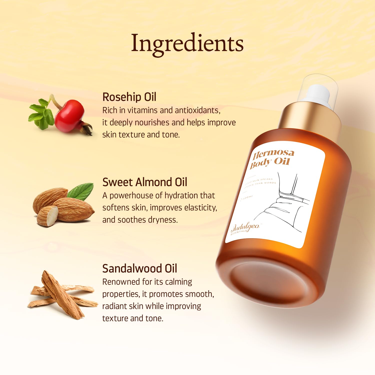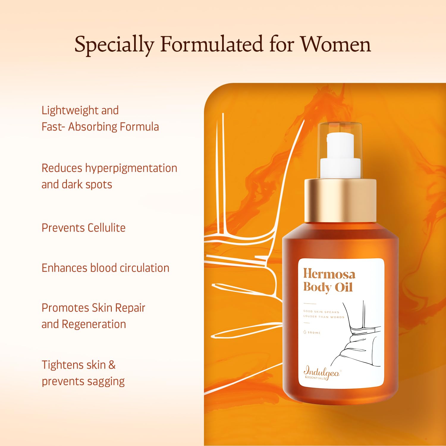 Indulgeo Essentials Hermosa Body Oil for Women | After Bath Body Oil to Reduce Dry Dull Dark Areas of Skin Like Underarms & Thighs | Help to Reduce Hyperpigmentation | Best for Winters to Moisturize Skin - (100 mL)