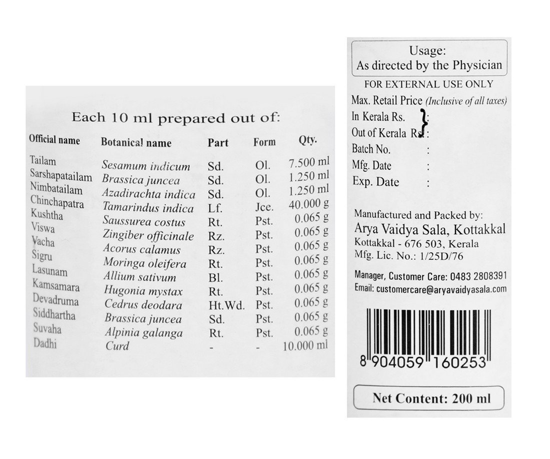 Ingredients: Tailam sarshapatailam nimbatailam chinchapatra kottam chukku vayampu sigru lasunam karttotti devadrumam siddhartha suvaha dadhi.