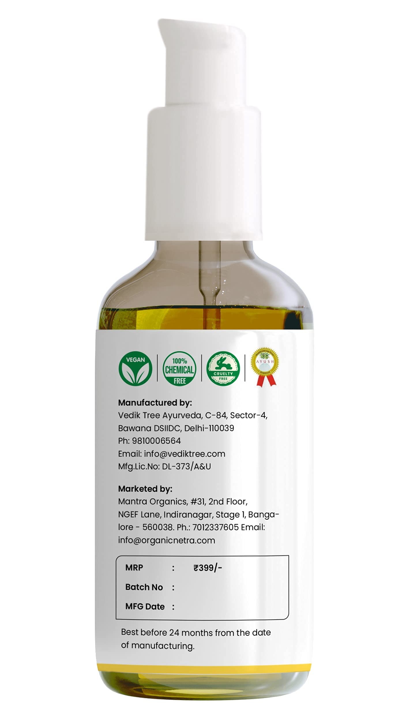• ORGANIC INGREDIENTS - ABSOLUTELY NO ITIVES: Organic Netra face and hair oil are completely organic. It is blended and derived from almonds apricot avocado sunflower wheat germ rosehip and coconut oils. This plant-based essential oil absorbs quickly and ef