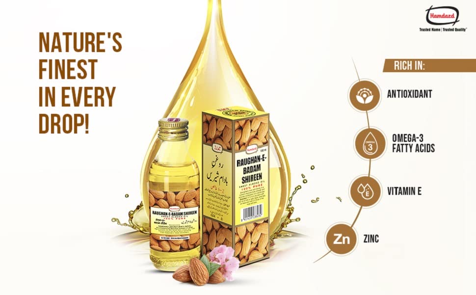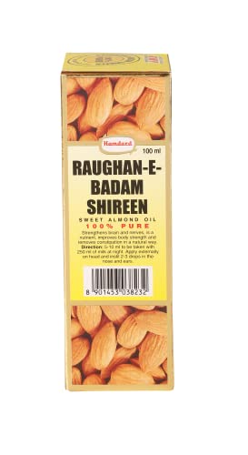 Almond oil had been used extensively for its health benefits and as a beauty aid much before science caught up with its goodness. Its purity is something you can trust with your eyes closed. The sweet almond oil has all your health and beauty secrets packed in a bottle and comes exclusively from edible almonds is selectively cultivated for their sweet taste. It is the oil popularly used for skin and hair care. It has many culinary uses too. Rogan badam shirin a sweet almond oil it's perfect health goof for heart fight dandruff nourishes skin prenatal/postnatal care.