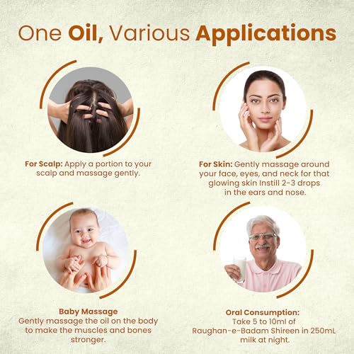 Almond oil had been used extensively for its health benefits and as a beauty aid much before science caught up with its goodness. Its purity is something you can trust with your eyes closed. The sweet almond oil has all your health and beauty secrets packed in a bottle and comes exclusively from edible almonds is selectively cultivated for their sweet taste. It is the oil popularly used for skin and hair care. It has many culinary uses too. Rogan badam shirin a sweet almond oil it's perfect health Goof For heart Fight Dandruff Nourishes Skin prenatal / postnatal care.