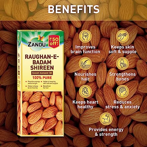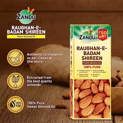 Zandu Raughan-E-Badam Shireen is made with 100% Pure Sweet Almond Oil. It can be orally consumed or can be applied on scalp or skin. It helps to keep brain healthy keeps skin soft and supple beneficial for hair provides energy and strength