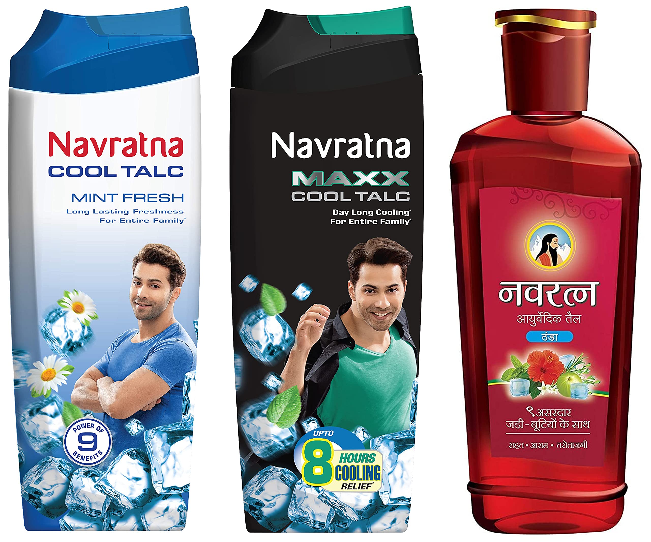 Navratna Maxx Cool Talc |Ice Cooling Effect |For Last Lasting Freshness and Fragrance| Instant Sweat Control 400gmPresenting Navratna Maxx Cool talc enriched with natural ingredients that keep you cool for entire day. It is the only cooling talcum powder in India with sweat Activated cooling technology. Now stay cool and fresh for entire day.Navratna Ayurvedic Cool Oil |Power of 9 Ayurvedic Herbs | Relieves Headache Fatigue Sleeplessness and Tension 500mlThanda Thanda Cool Cool' brand Navratna has been the most trusted and preferred brand in the therapeutic cooling oil segment for a very long time. It has been meticulously prepared from a combination of nine unique ayurvedic herbs. Its everyday massage gives enjoyable cooling which provides relief from daily mental and physical stress- and its related symptoms like headache fatigue tension insomnia etc. It not only solves specific hair and body related ailments but delivers superlatively on all desired benefits like beauty & nourishment traditionally sought from hair oils. Organic - YesNavratna Cool Mint Fresh Talc | Instant Sweat Absorption and Cooling Effect |Body Odour Protection | Long Lasting Freshness and Fragrance 400gmThanda thanda cool cool refreshes and relaxes your body and mind. A breakthrough thanda thanda cool cool talc with the goodness of cool herbal aroma therapy to refresh and relax your body and mind from the unbearable heat and stress. Its refreshing cool aroma rejuvenates your senses and keeps you vibrant and fresh all day long.