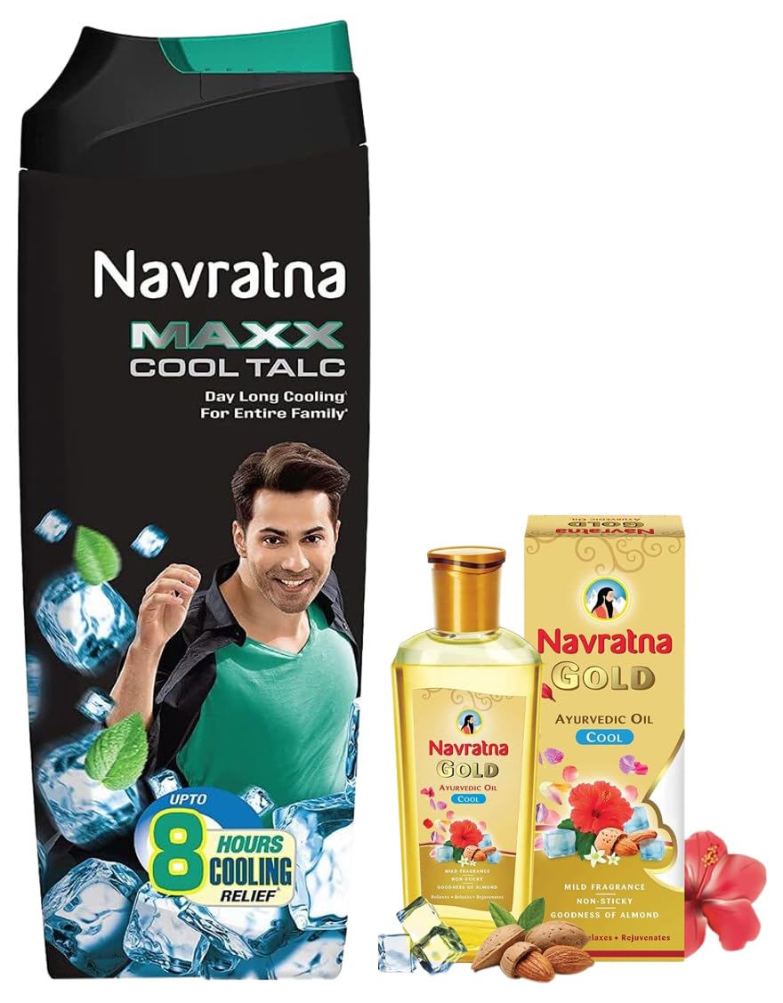 Navratna Maxx Cool Talc |Ice Cooling Effect |For Last Lasting Freshness and Fragrance|Instant Sweat Control 400gmPresenting Navratna Maxx Cool talc enriched with natural ingredients that keep you cool for entire day. It is the only cooling talcum powder in India with sweat Activated cooling technology. Now stay cool and fresh for entire day.Navratna Gold Ayurvedic Oil |Non Sticky and Non Greasy |Mild Fragrance| Goodness of Almonds and 9 Ayurvedic Herbs |Relieves Body Aches Sleeplessness Headache and Fatigue 200mlNavratna Gold is a marvel of ayurveda. This light non-sticky oil is a blend of premium herbs and exotic flowers. Its blissful massage brings alive the cooling of mountains and smell of exotic flowers to refresh and rejuvenate you. Whenever you need relief from shadow and stress try this enriching experience.