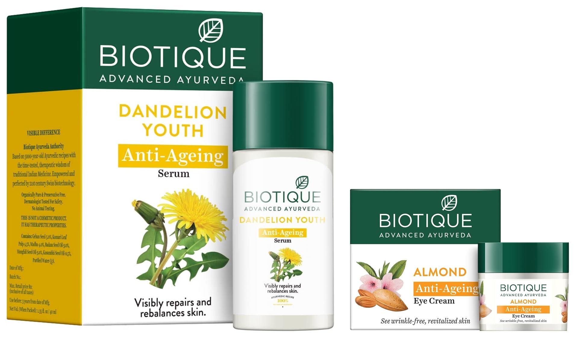 Biotique Bio Dandelion Visibly Ageless Serum 40 mlThis ligtening serum is a rare combination of pure dandelion rich in Vitamin E and minerals blended with nutmeg oil. Used regularly it helps brighten skin fade dark spots and ease away wrinkles for a flawless complexion.Biotique Bio Almond Soothing And Nourishing Eye Cream 15gA light nourishing cream to help protect your delicate skin around the eyes. Contains Oils of Nutmeg Almond Sunflower and Quince Seed Gel that increase the brightness and add sparkle to your eye while reducing puffiness dark circles and fine lines around the eye.