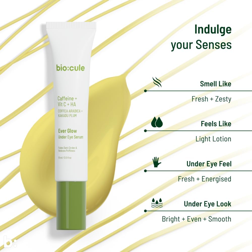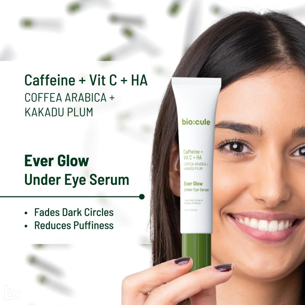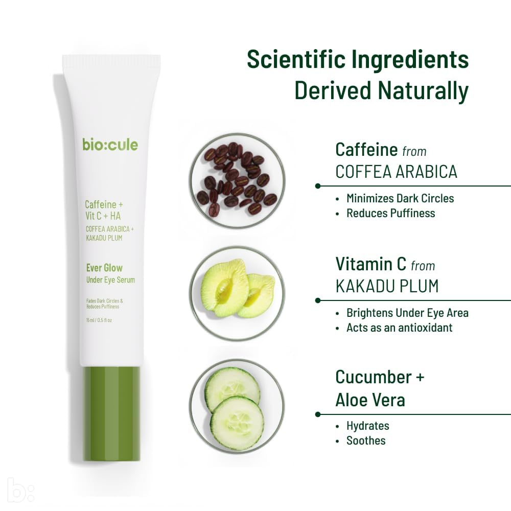 FROM NATURE WITH SCIENCE: biocule Ever Glow Under Eye Serum with Caffeine from Coffea Arabica Vitamin C from Kakadu Plum & Cucumber is a powerful skincare product designed to target and reduce under eye dark circles & puffiness.