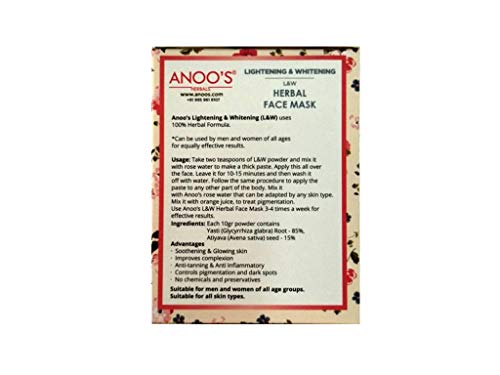 Anoos Lightening and Whitening (L&W) Herbal Face Mask is a chemical-free face mask that naturally nourishes lighten & brighten your skin tone prevents discoloration & hyper-pigmentation reduces blemishes excess oil & formation of spots/ marks protects skin from UV rays removes dead skin cells impurities & dirt from within and give your skin a refreshing feeling and all this without any usage of harmful chemicals like silicone and paraben. This mask addresses uneven skin tone and dark spots problem while improving skin quality for a brighter and more luminous complexion. Include this mask in your facial care regime especially when you want a quick revival of your skin to get the best results. Use it before heading to parties or any special occasion and adore a skin with a youthful healthy glow. Regular use of Anoos L&W Herbal Face Mask will lighten your skin tone soften your skin by leaving it smooth & supple and also improves the complexion tan and glow of the skin. The product is good for sensitive skins too and can be used on any part of the body.