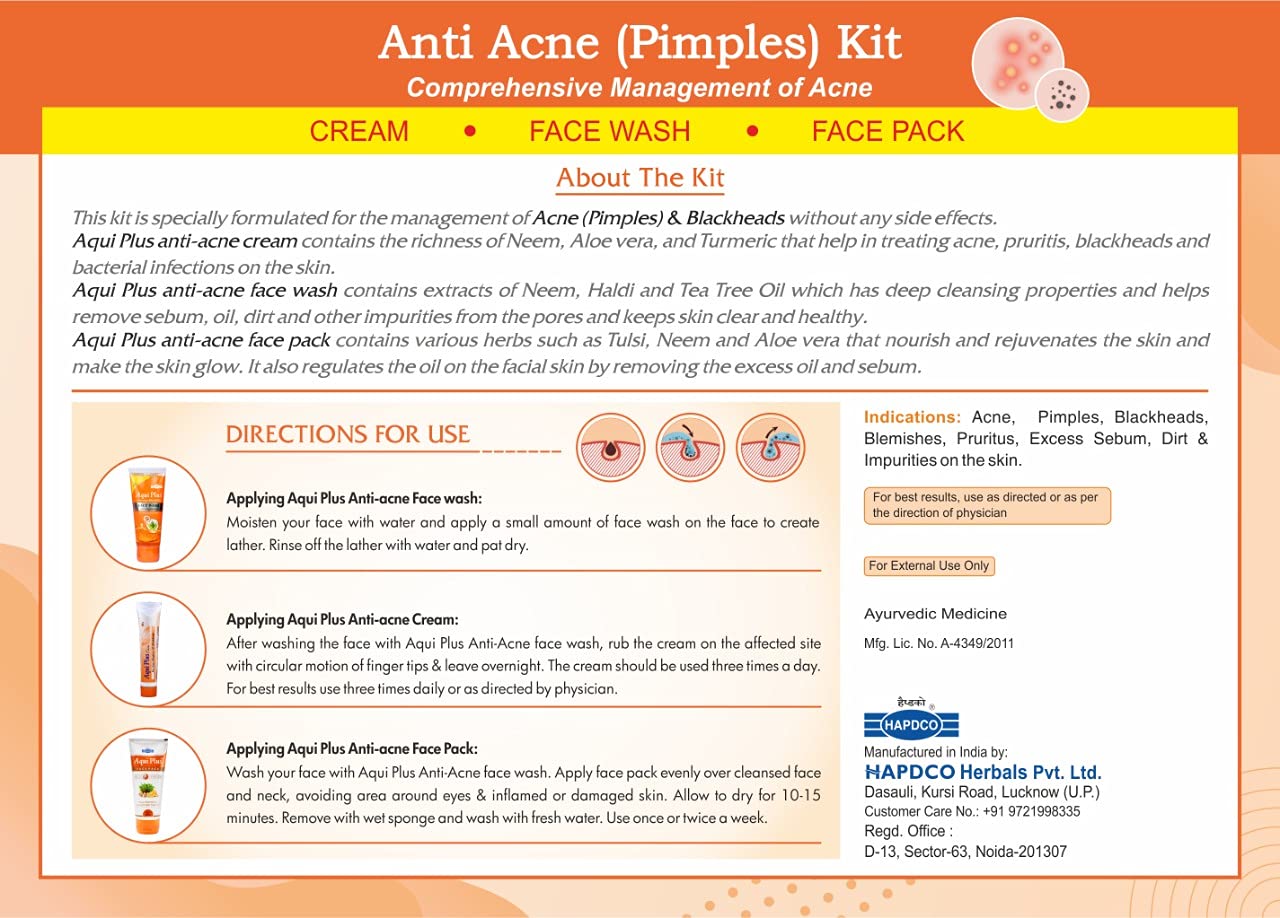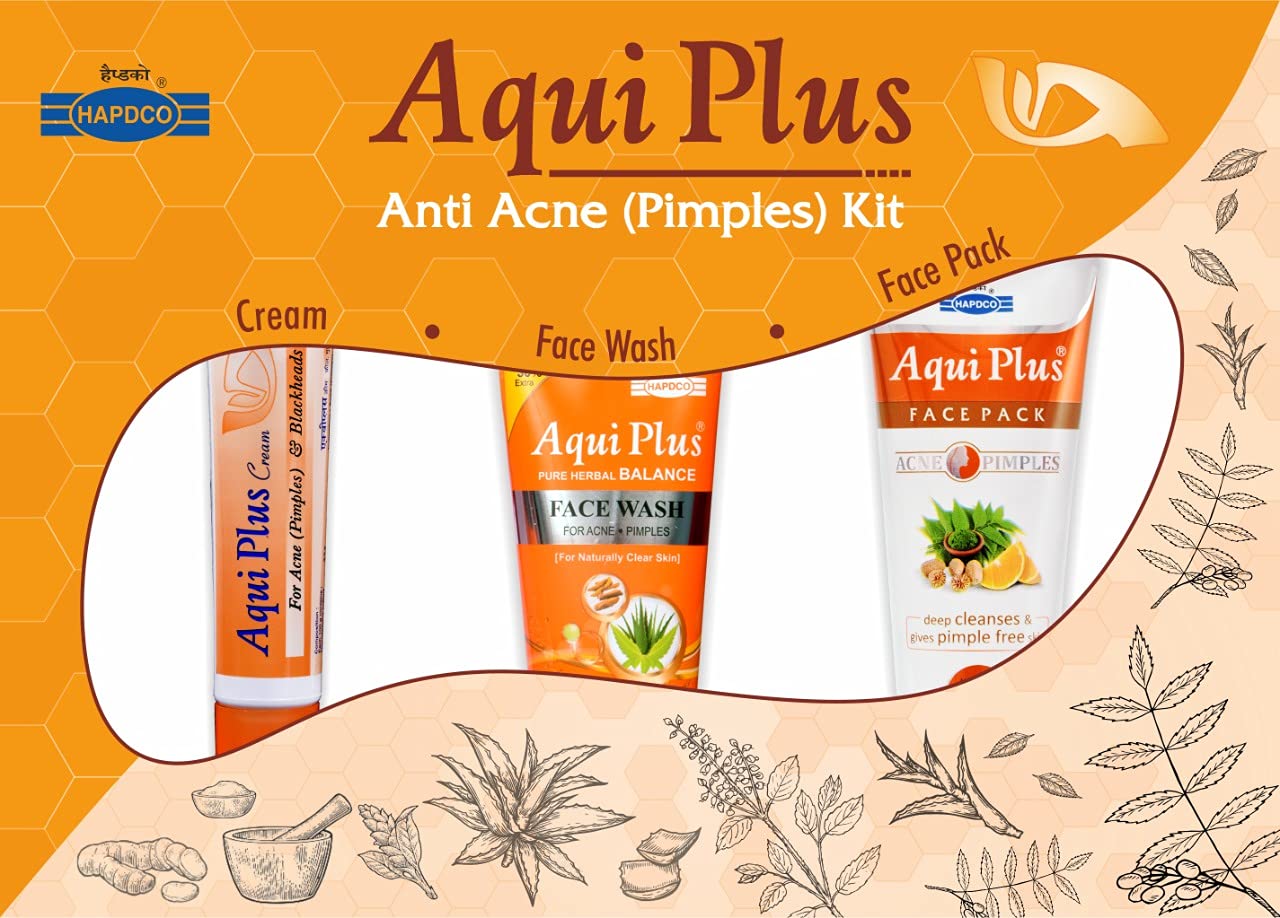 this kit which contains Aqui Plus Cream Aqui Plus Face wash & Aqui Plus Face pack is specially formulated for the management of Acne (Pimples) & Blackheads without side effects.