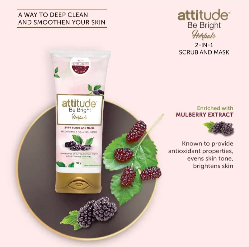 Attitude Be Bright Herbals 2-in-1 Scrub & Mask is a Paraben-free Silicon-free clay-based formula that brightens* your skin guards it from pollution** and helps in improving the appearance of your skin through gentle exfoliation & pore tightening. The main functionality of this product is the ability to use it as a Scrub and/or Mask depending on your mood. It contains the goodness of many exotic herbal ingredients like Mulberry Extract Herbal Blend which is a combination of Indian Pennywort Sea Buckthorn Sandalwood & Aloe Vera. How to Use : As a scrub: Apply all over your wet face. Rub in a circular motion then rinse thoroughly. As a mask: Wet your face. Apply a thin layer of the product on your wet face. Avoid the eye area to avoid irritation or infection. Let it dry for a few minutes then rinse thoroughly. As a scrub and mask: Gently scrub for 2-3 minutes to exfoliate then leave it to dry for a few minutes. Wash thoroughly.