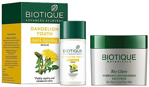 Biotique Bio Clove Purifying Anti Blemish Face Pack 75gThis product is a antibiotic antiseptic and antiviral purifying anti-blemish pack blended with pure clove and wild turmeric to control pimples absorb excess oils and other embedded impurities that can cause acneic conditions.Biotique Bio Dandelion Visibly Ageless Serum 40 mlThis ligtening serum is a rare combination of pure dandelion rich in Vitamin E and minerals blended with nutmeg oil. Used regularly it helps brighten skin fade dark spots and ease away wrinkles for a flawless complexion.