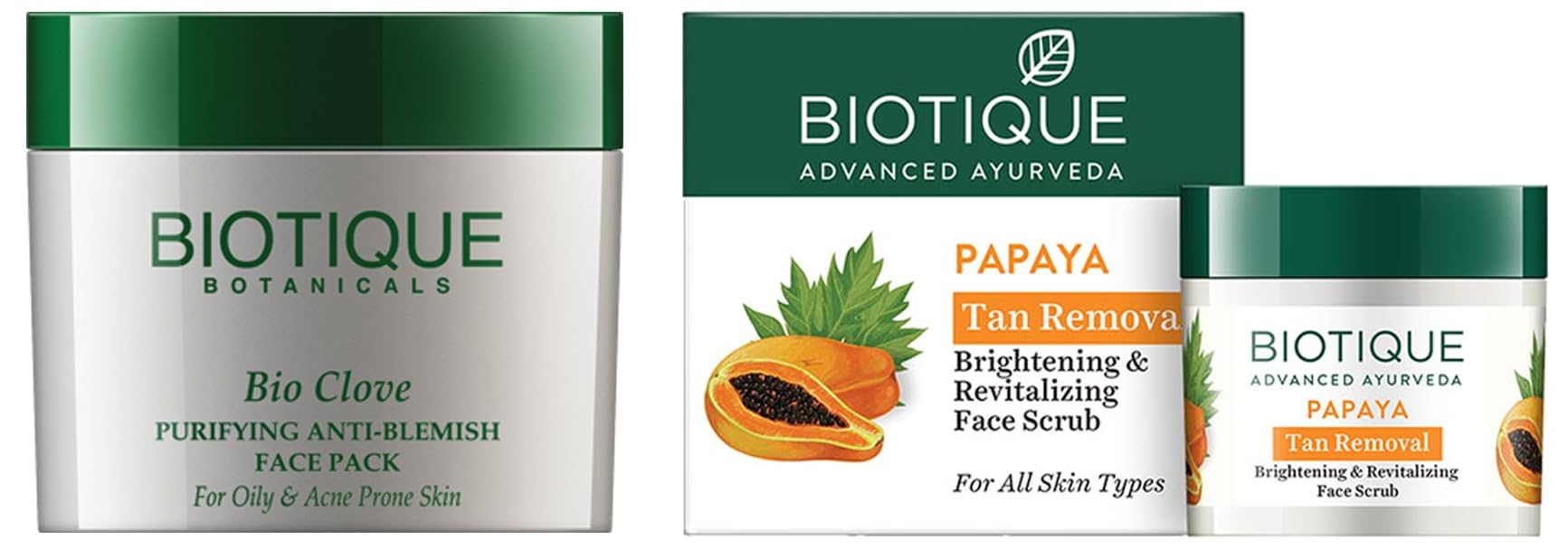 Biotique Bio Clove Purifying Anti Blemish Face Pack 75gThis product is a antibiotic antiseptic and antiviral purifying anti-blemish pack blended with pure clove and wild turmeric to control pimples absorb excess oils and other embedded impurities that can cause acneic conditions.Biotique Bio Papaya Revitalizing Tan Removal Scrub 75gPapaya is a luscious tropic fruit with enzymes known for their revitalizing and healing benefits. It dissolves dead surface cells unclogs pore openings and smooth the way for clear skin to surface. Gentle refining action uncovers skin's natural brightness for a younger looking complexion.