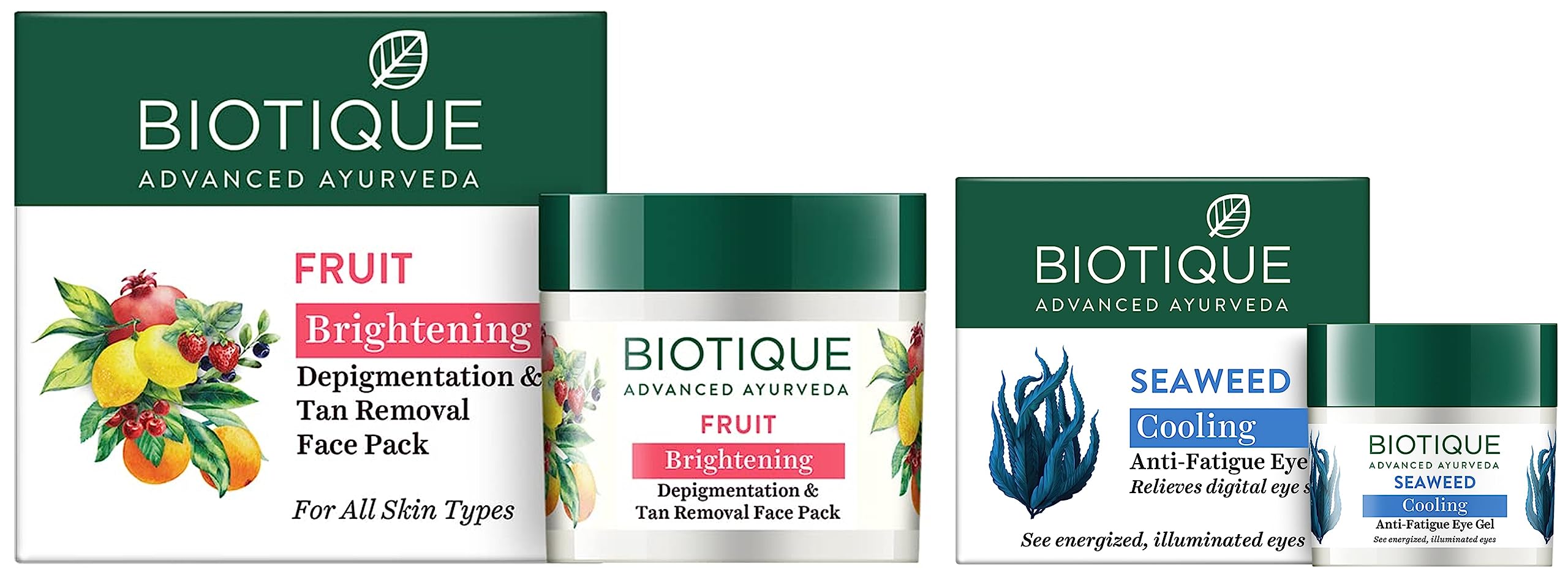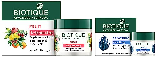 Biotique Bio Fruit Whitening And Depigmentation & Tan Removal Face Pack 75gThe juices of Pineapple Tomato Lemon and Papaya fruit leave your skin clear youthful and fresh. It keeps away sun tan and skin blemishes. Every day use helps to make skin fairer and firmer.Biotique Bio Seaweed Revitalizing Anti Fatigue Eye Gel 15gA transparent cool gel to refresh eye area. It revitalises and helps reduce dark circles sign of tiredness around the eyes while reducing puffiness.