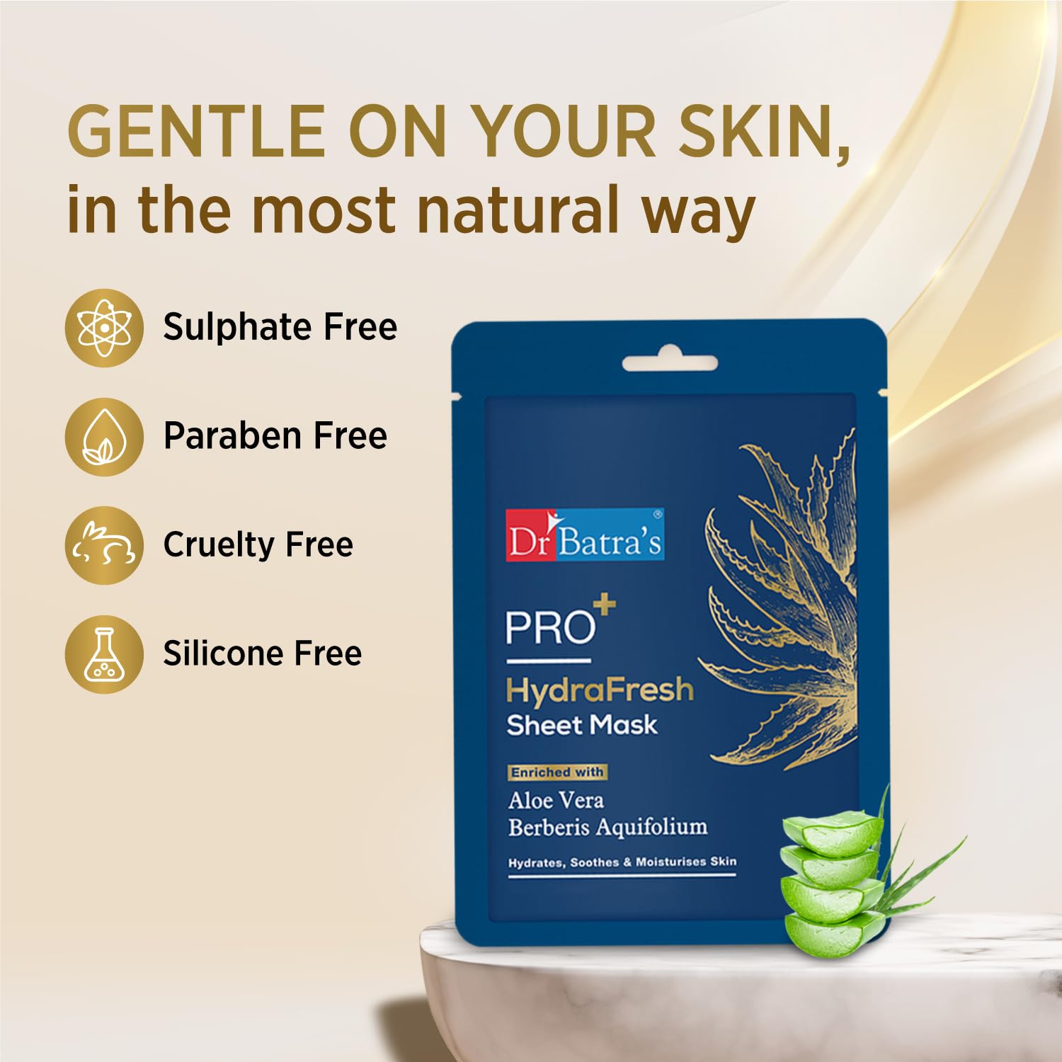 DR BATRA'S PRO+ Hydrafresh Sheet Fancy Coveris enriched with Aloevera helps to treat dry skin and seal moisture into the skin. Berberis aquifolium helps for healthier and nourished skin. The deep cleansing action and toxins elimination from the skin produces plump soft and clear skin . Suitable for all skin types . Skin feels hydrated awakened and healthier. Easy to use for instant results.
