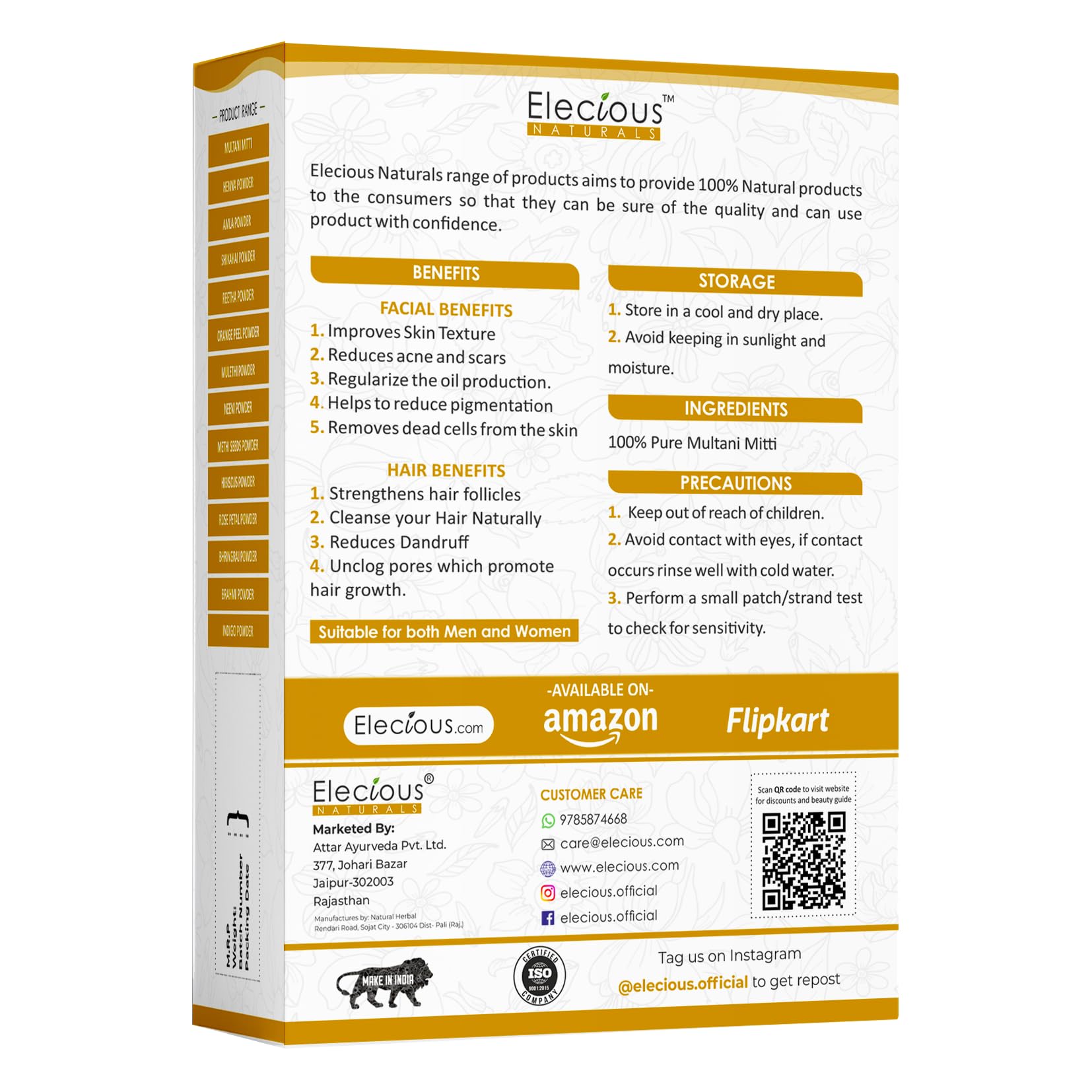 • 100% PURE AND Naturals AL: Elecious Multani mitti is 100% pure and Naturals and is free from any preservative or chemical.