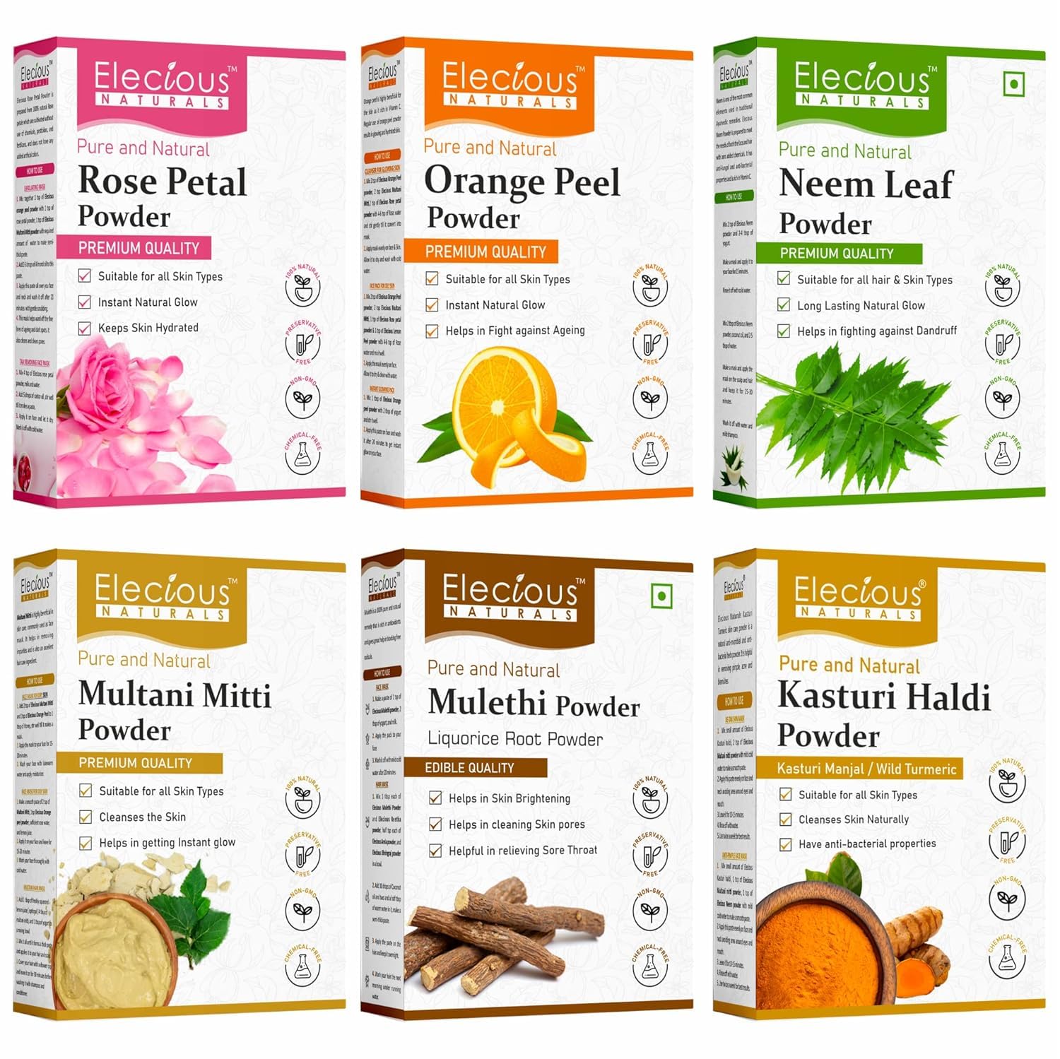 Elecious Complete Skin Care Kit Combo- Contains 6 Products (Mulethi Powder Multani Mitti Powder Kasturi Haldi Powder Orange Peel Powder Neem Powder & Rose Petal Powde) | 100% Natural