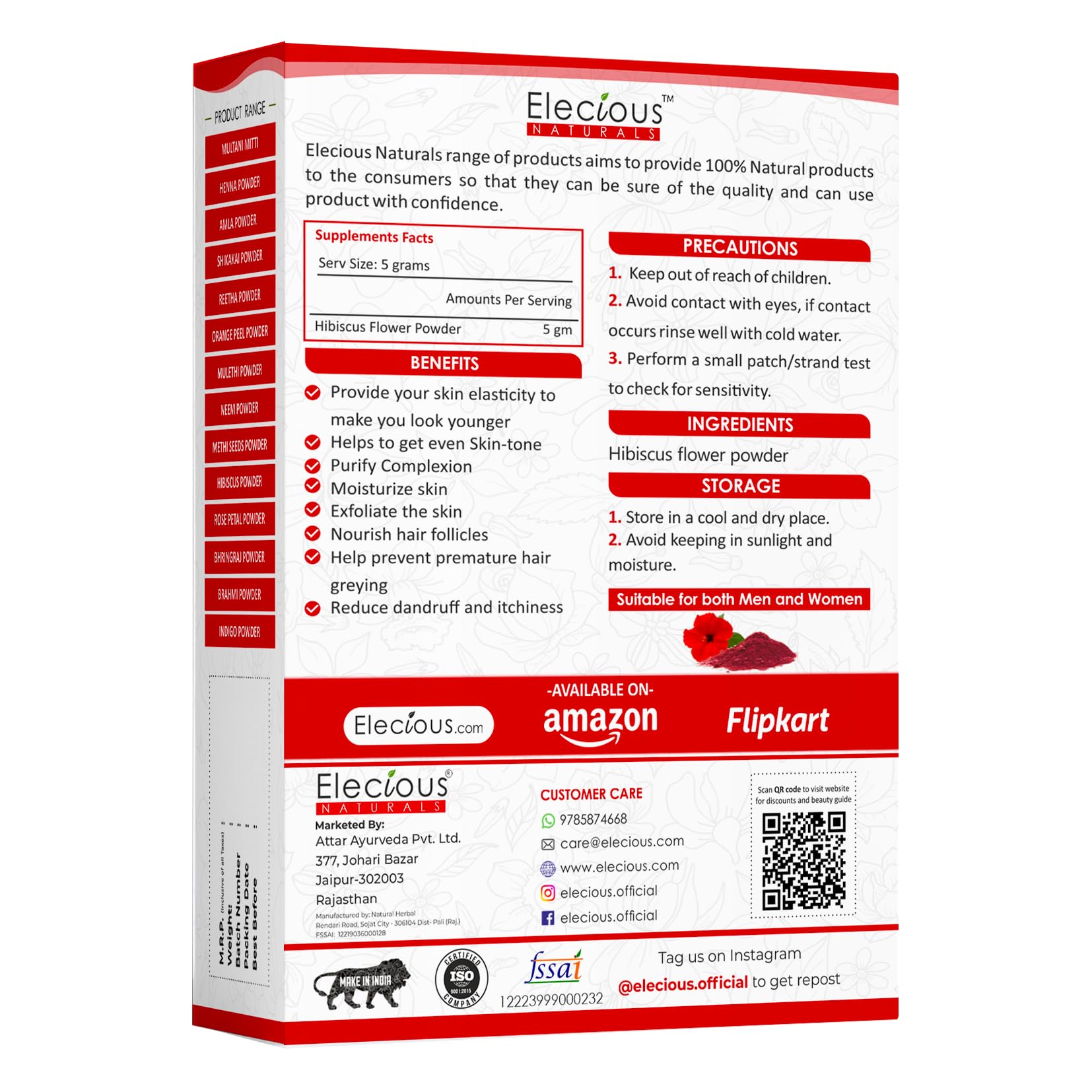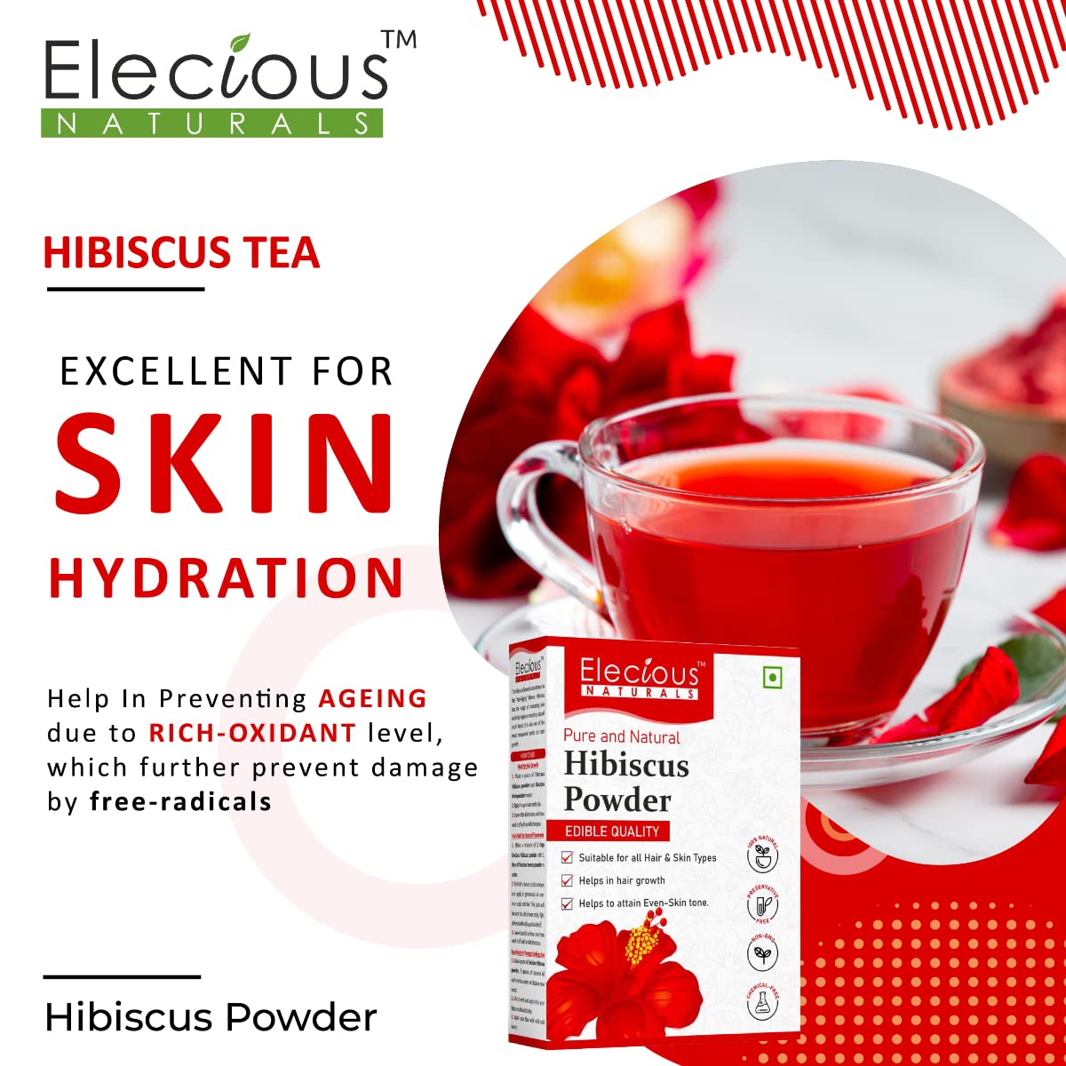 • EDIBLE GRADE: Elecious Hibiscus flower powder is Edible and can be used for oral consumption along with hair and skin application. Preservative-free.